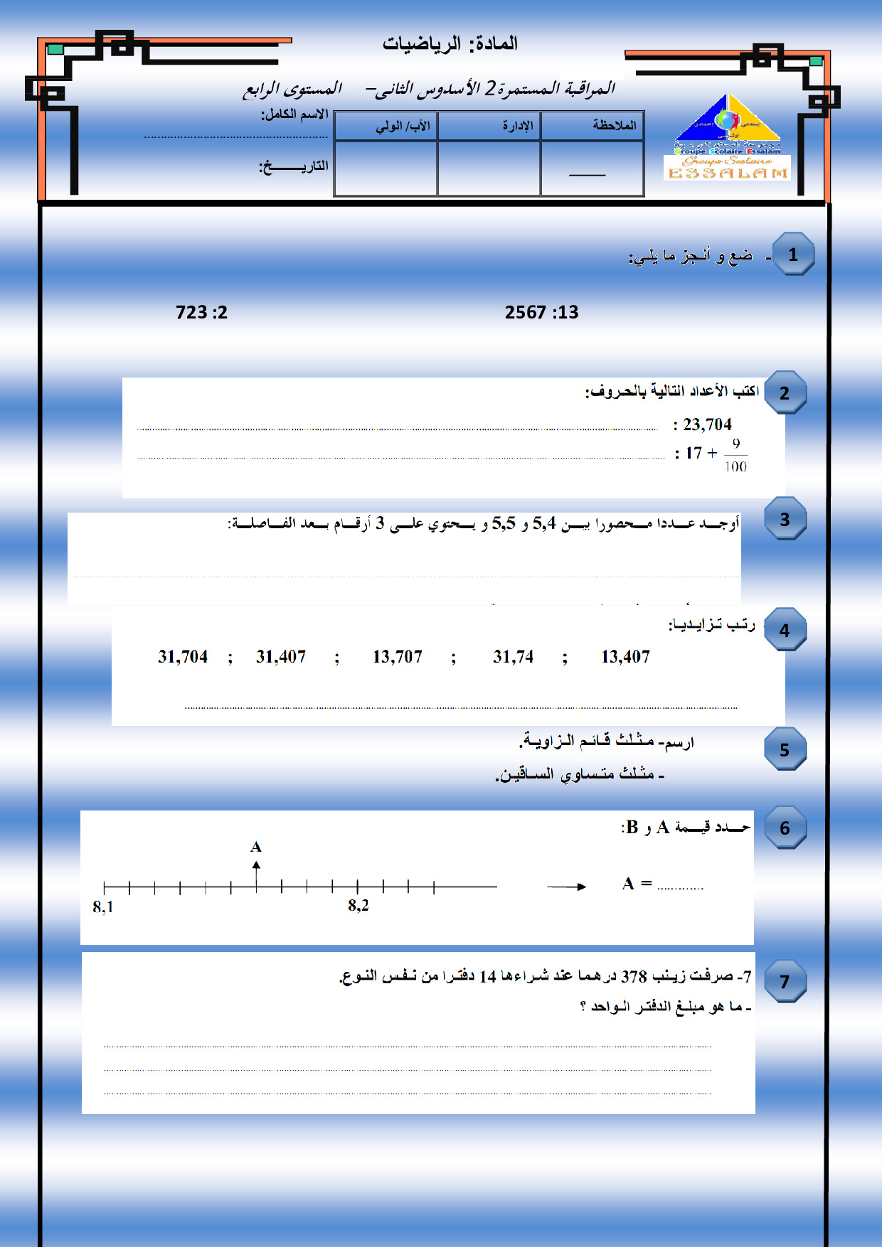 الفرض 2 نموذج 2 - الرياضيات رابع إبتدائي الدورة الثانية