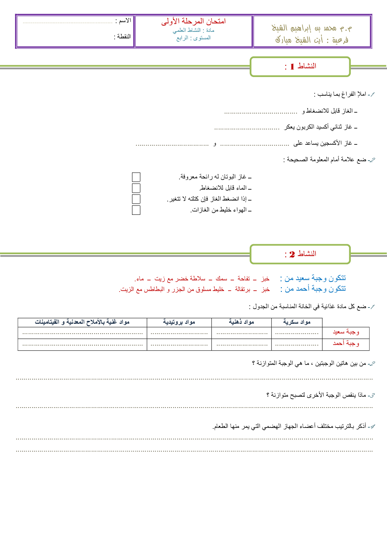 الفرض 1 نموذج 2 - النشاط العلمي رابع إبتدائي الدورة الأولى