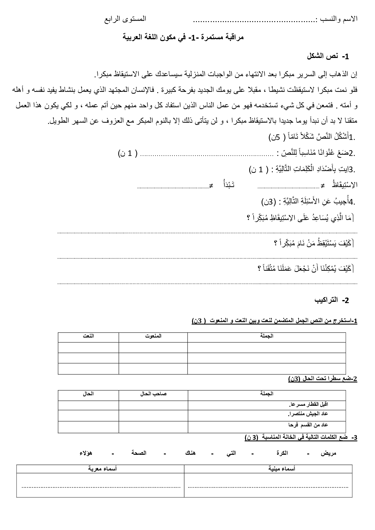 الفرض 1 نموذج 1 - اللغة العربية رابع إبتدائي الدورة الثانية