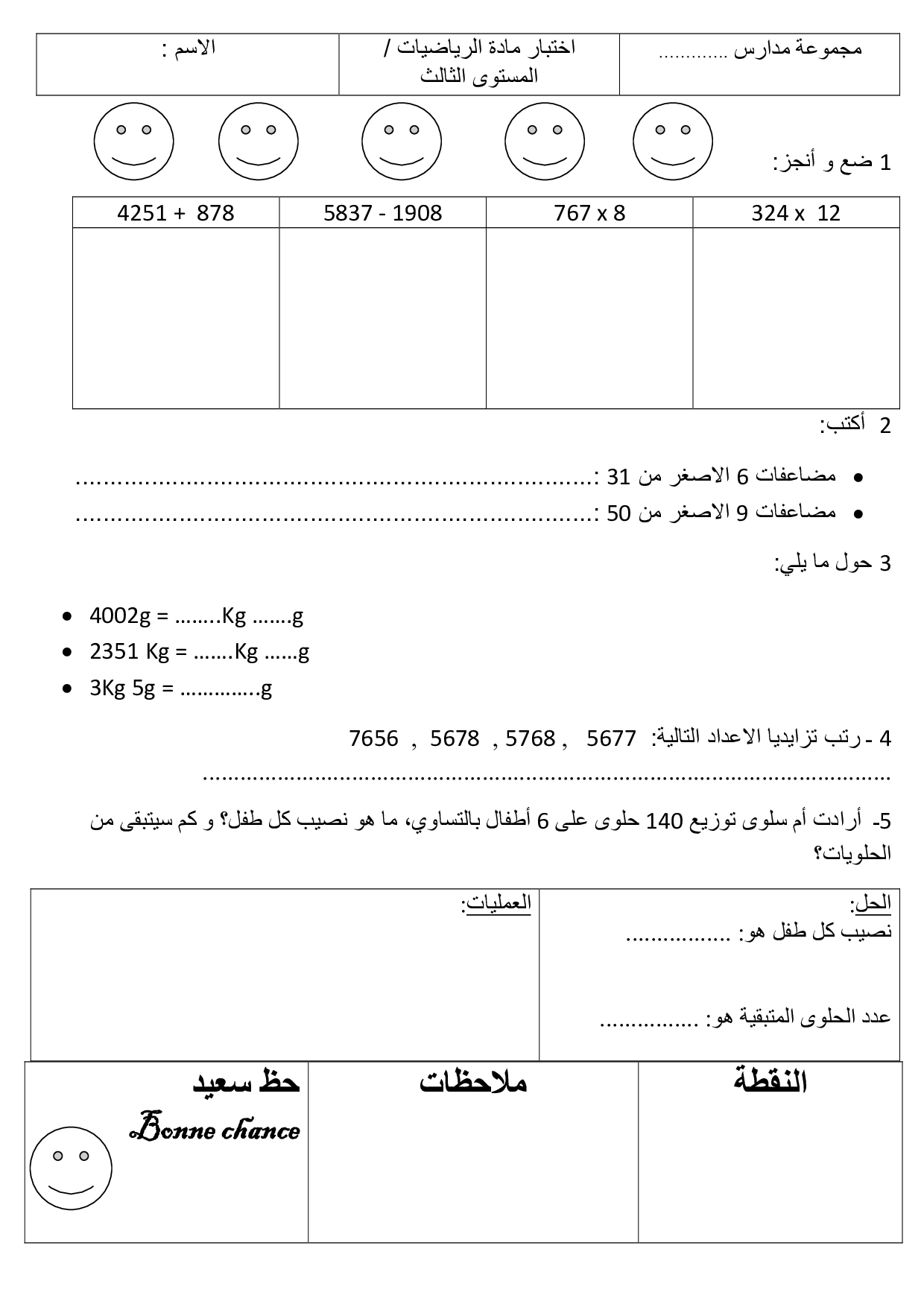 الفرض 1 نموذج 1 - الرياضيات ثالث إبتدائي الدورة الأولى