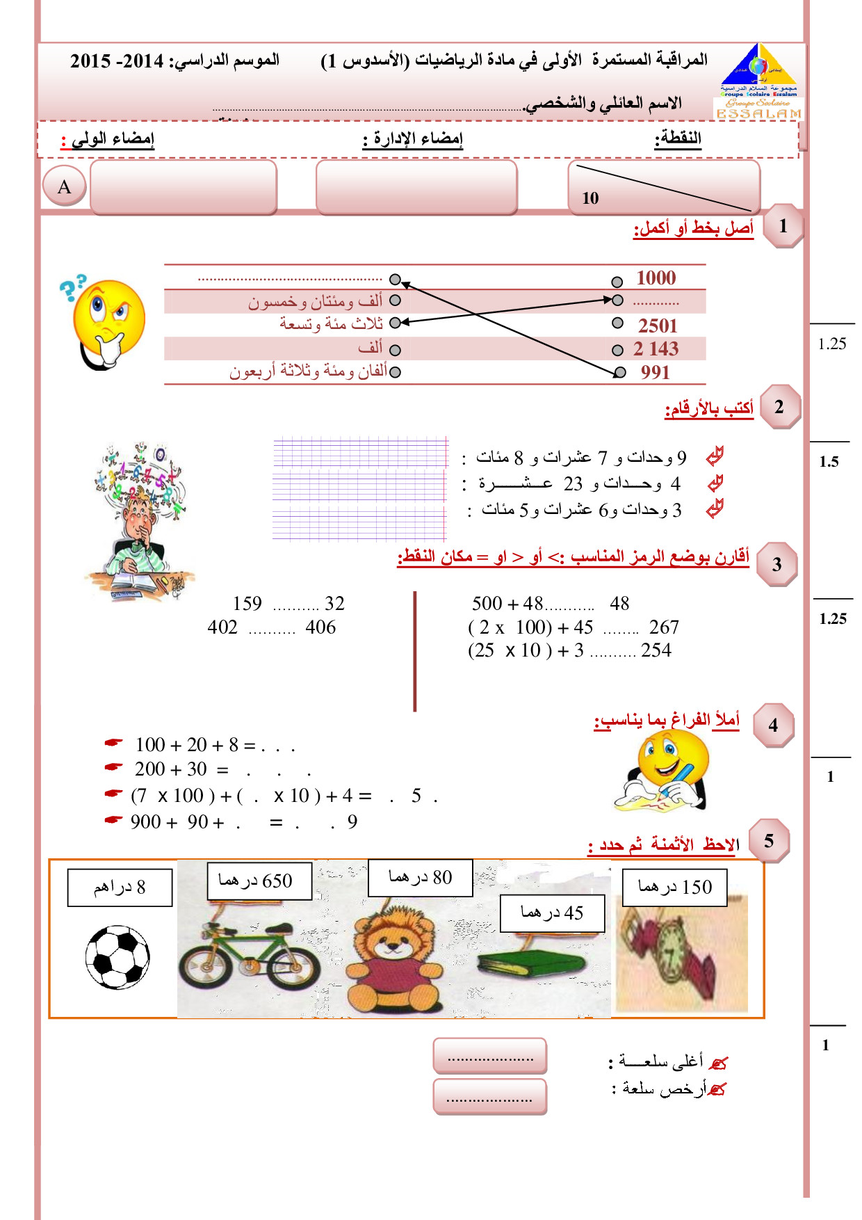 الفرض 1 نموذج 5 - الرياضيات ثالث إبتدائي الدورة الأولى