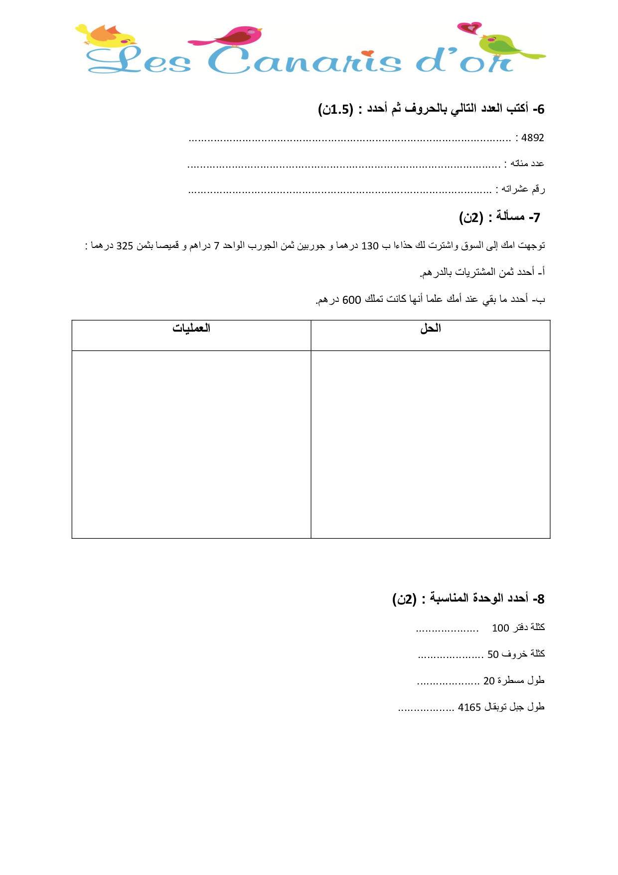 الفرض 1 نموذج 3 - الرياضيات ثالث إبتدائي الدورة الثانية