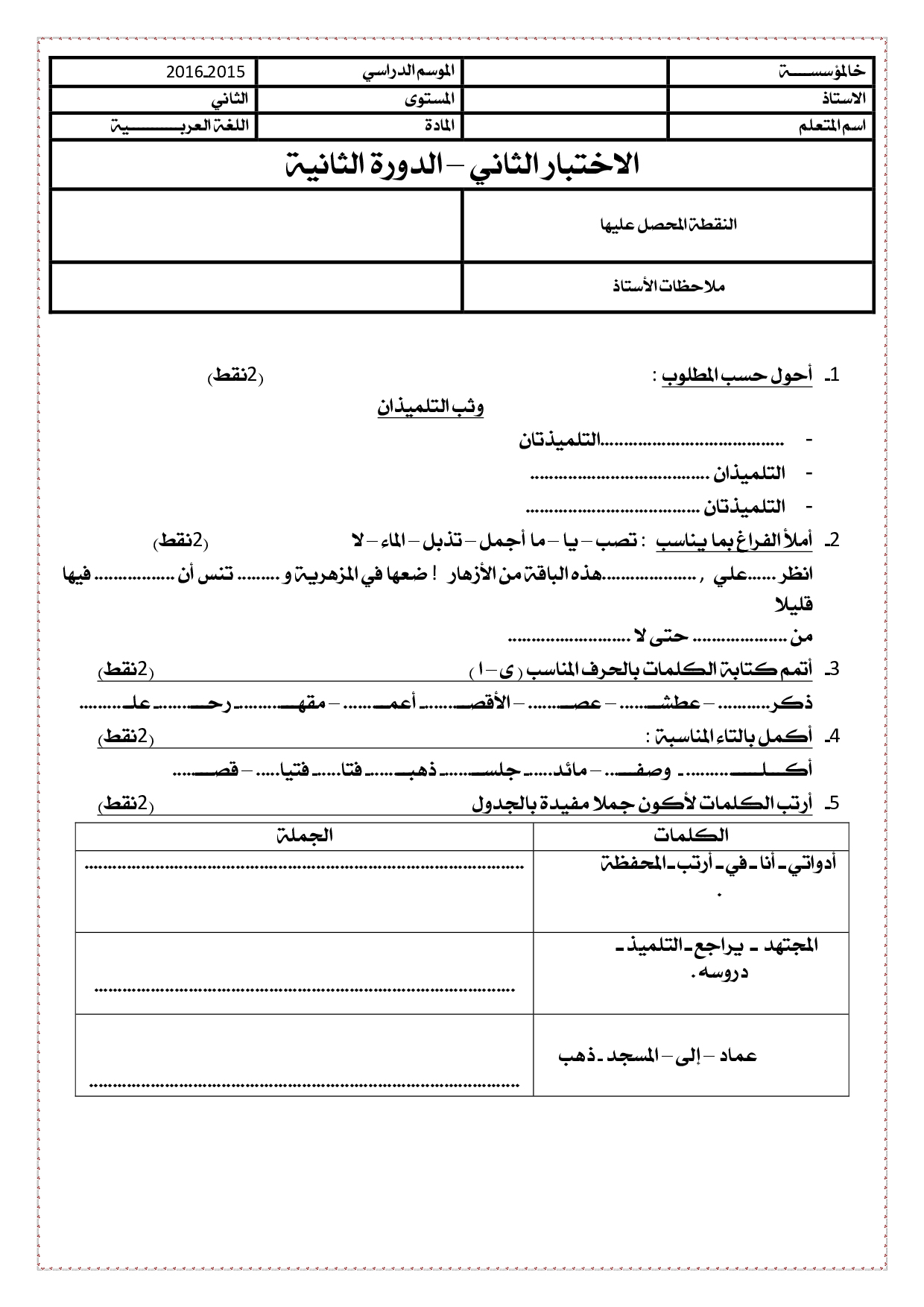 الفرض 2 نموذج 1 - اللغة العربية ثاني إبتدائي الدورة الثانية