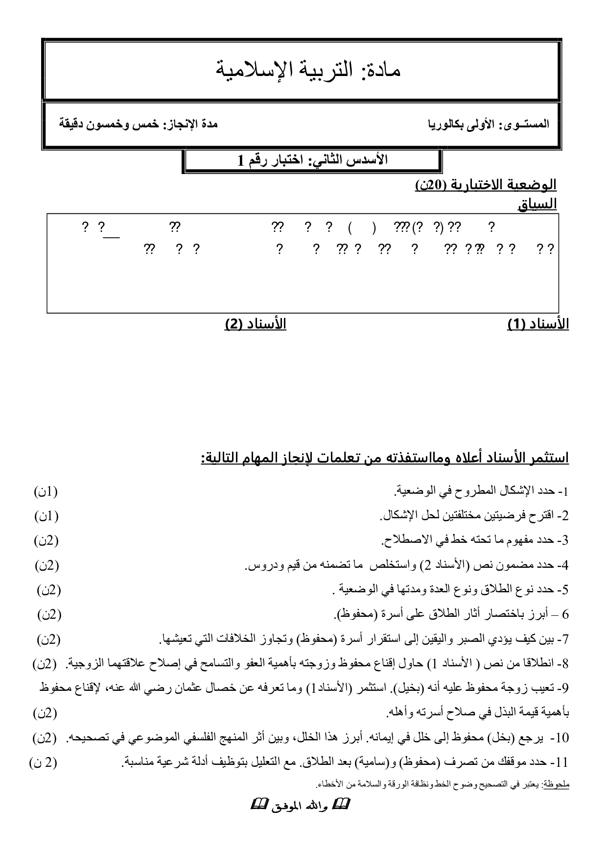 الفرض 1 نموذج 3 - التربية الإسلامية أولى باك الدورة الثانية