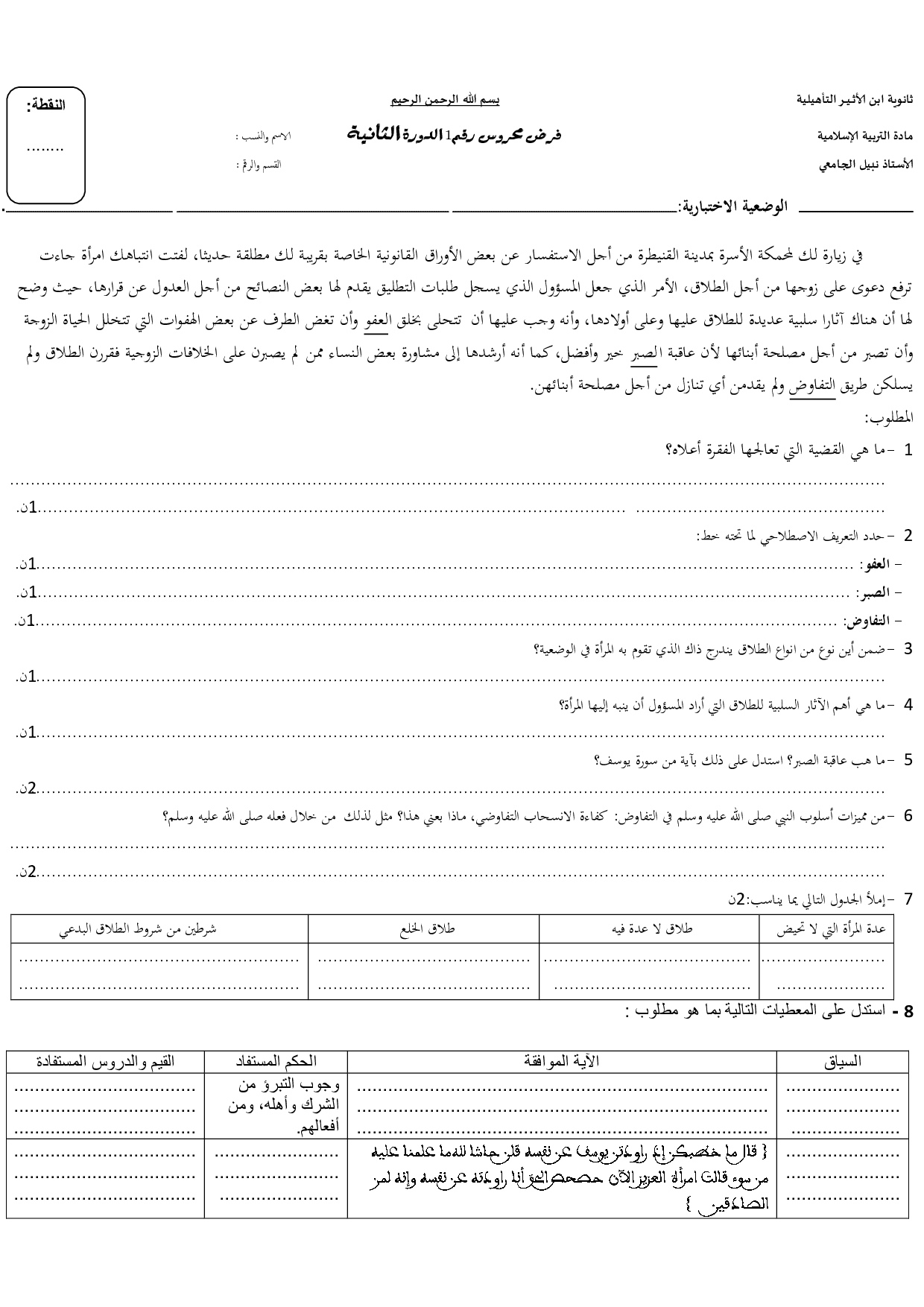 الفرض 1 نموذج 12 - التربية الإسلامية أولى باك الدورة الثانية