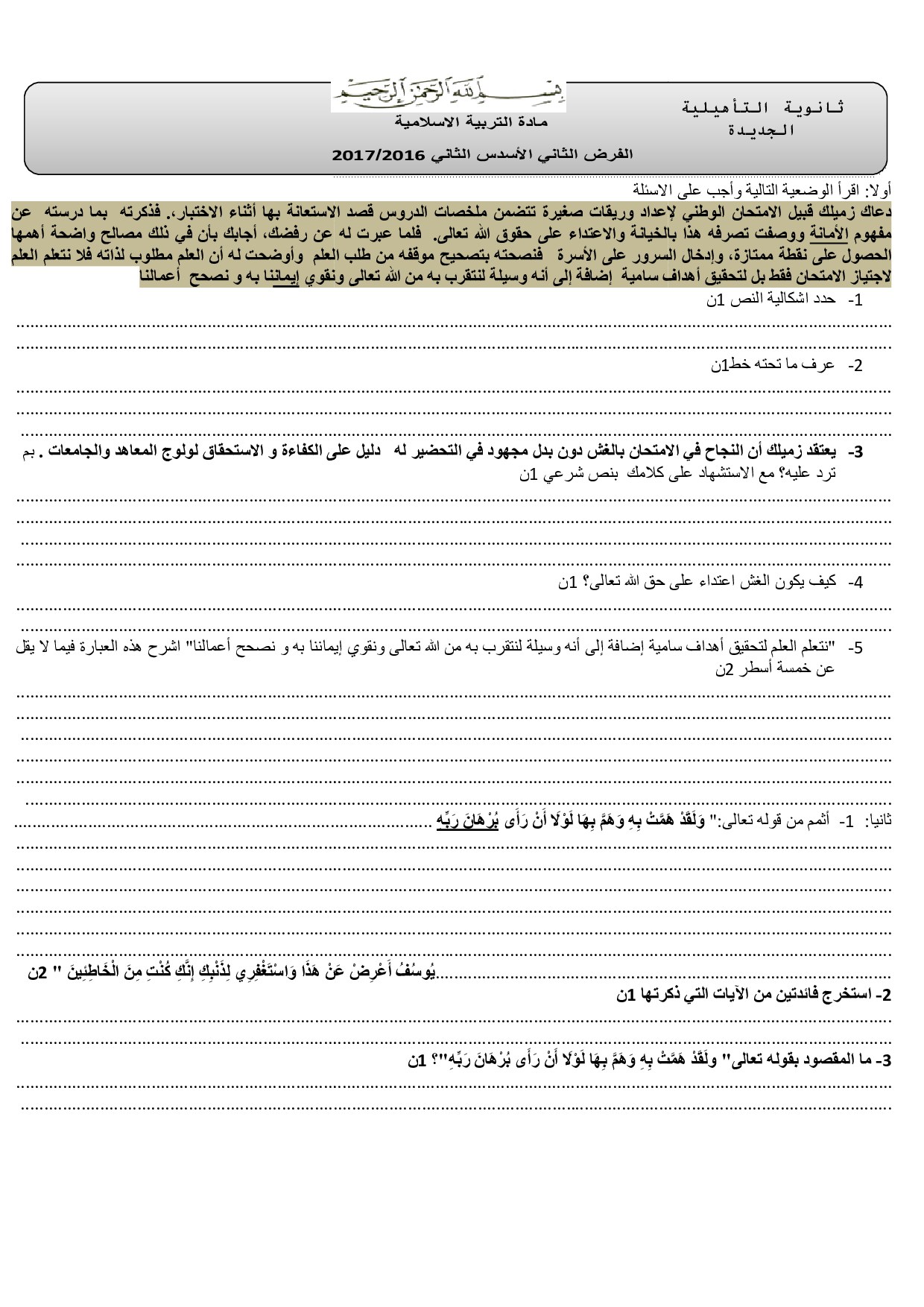 الفرض 2 نموذج 4 - التربية الإسلامية أولى باك الدورة الثانية
