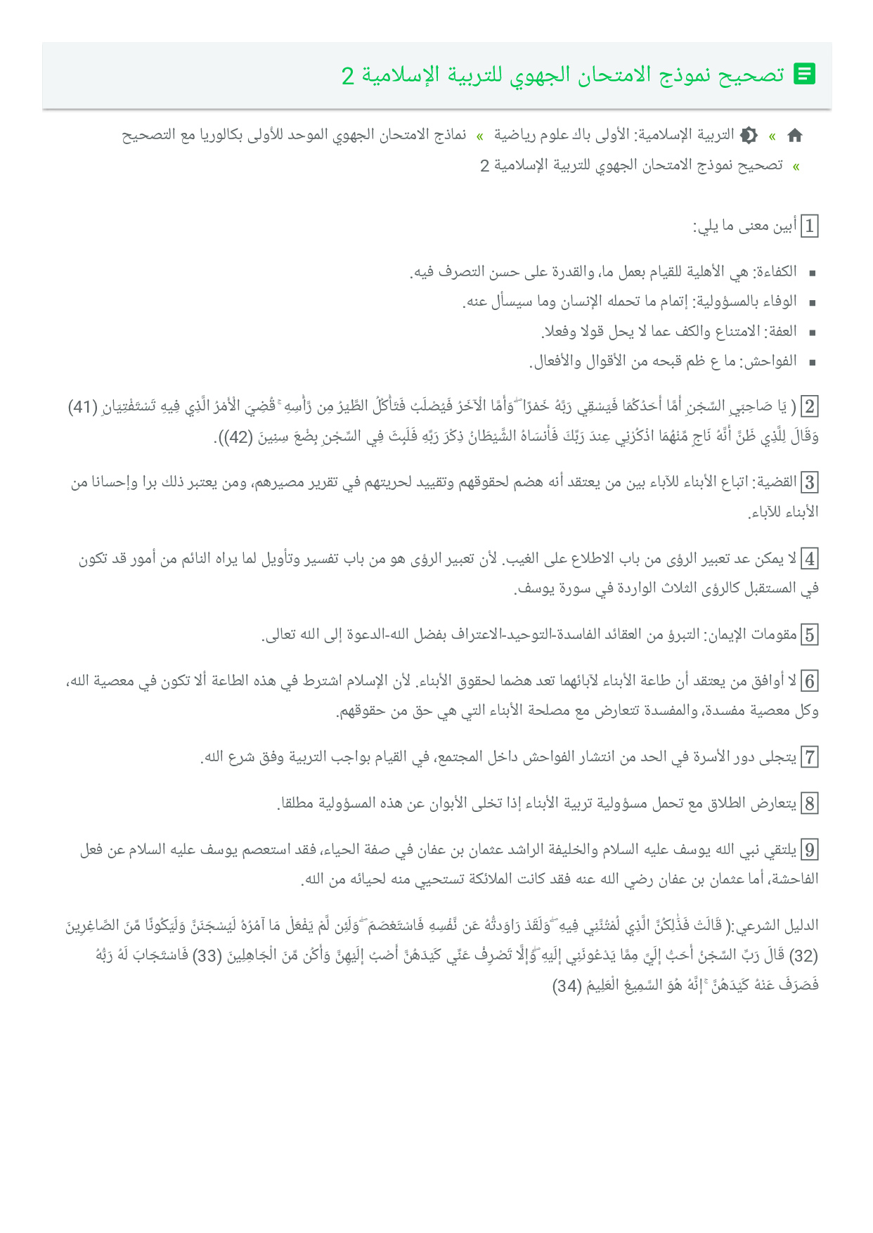 تصحيح نموذج الامتحان الجهوي للتربية الإسلامية 2