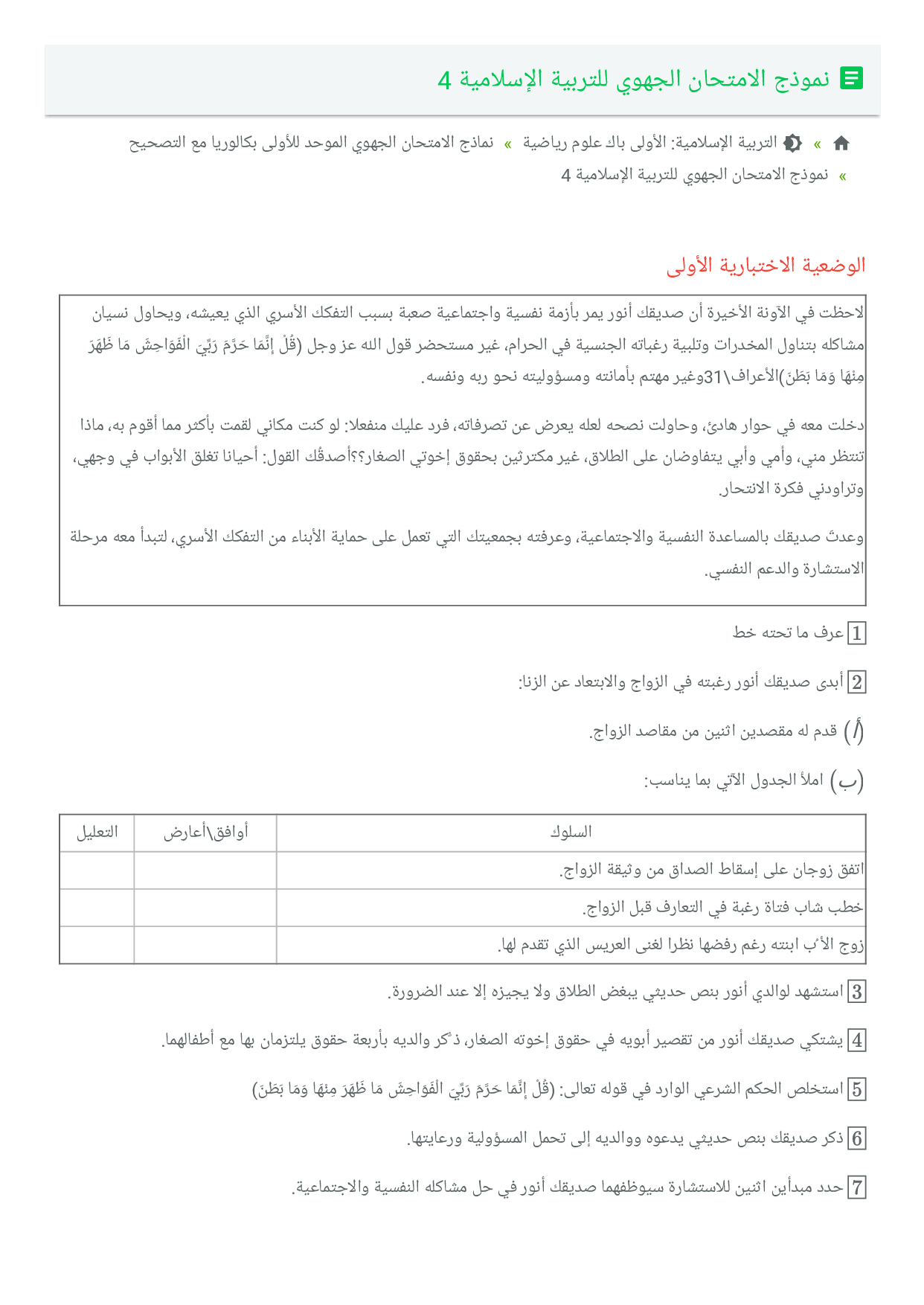 نموذج الامتحان الجهوي للتربية الإسلامية 4
