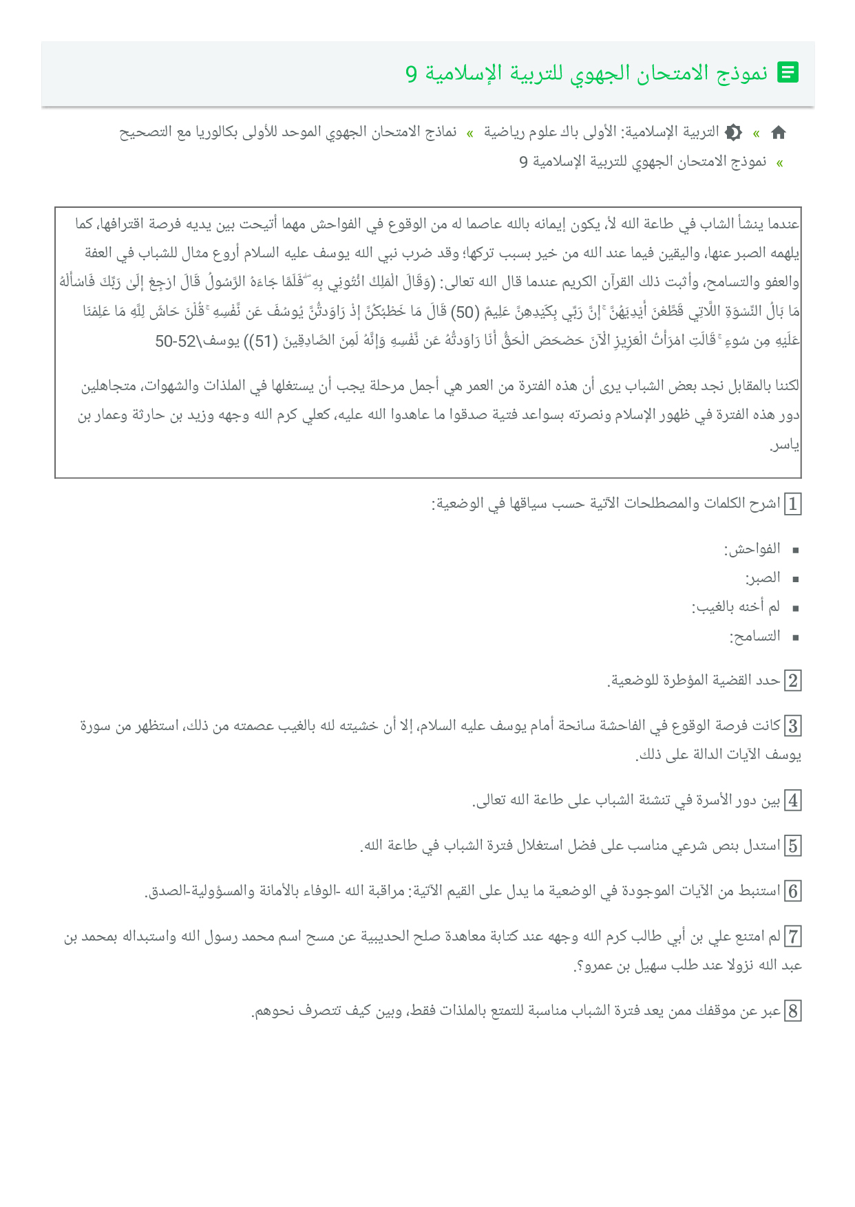نموذج الامتحان الجهوي للتربية الإسلامية 9