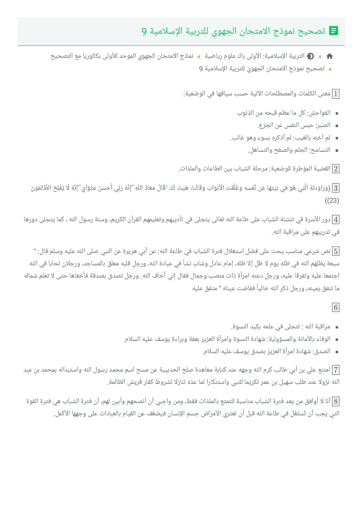 تصحيح نموذج الامتحان الجهوي للتربية الإسلامية 9