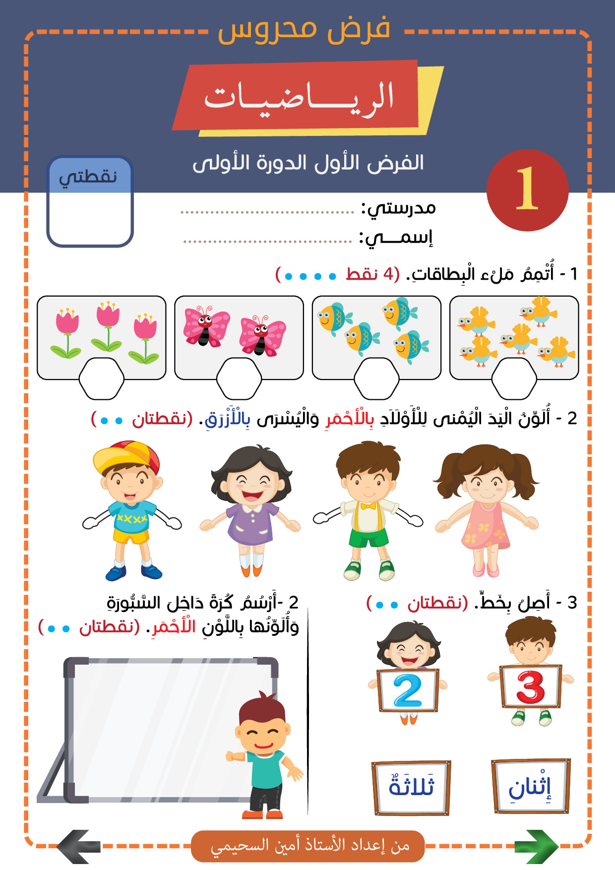 الفرض 1 نموذج 1 - الرياضيات أولى إبتدائي الدورة الأولى