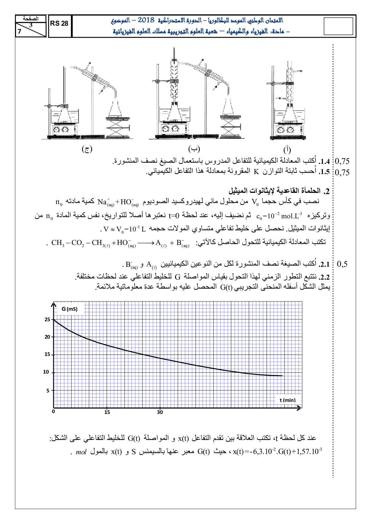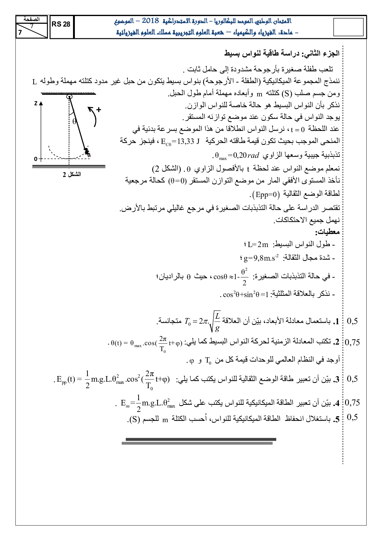 الفيزياء والكيمياء علوم فيزيائية 2018 الدورة الإستدراكية - الموضوع