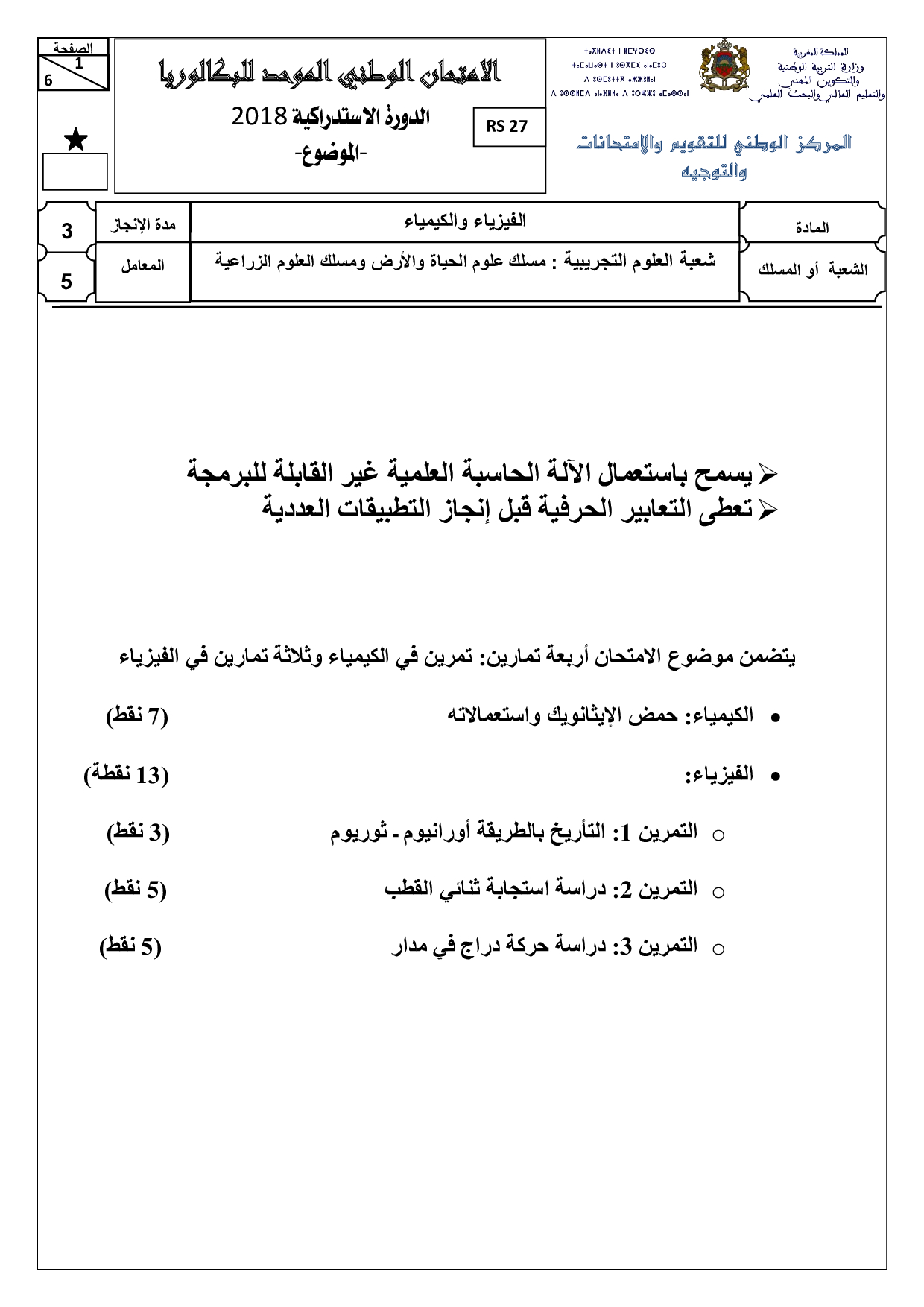 الفيزياء والكيمياء (علوم الحياة والأرض والعلوم والتكنولوجيات) 2018 الدورة الإستدراكية - الموضوع