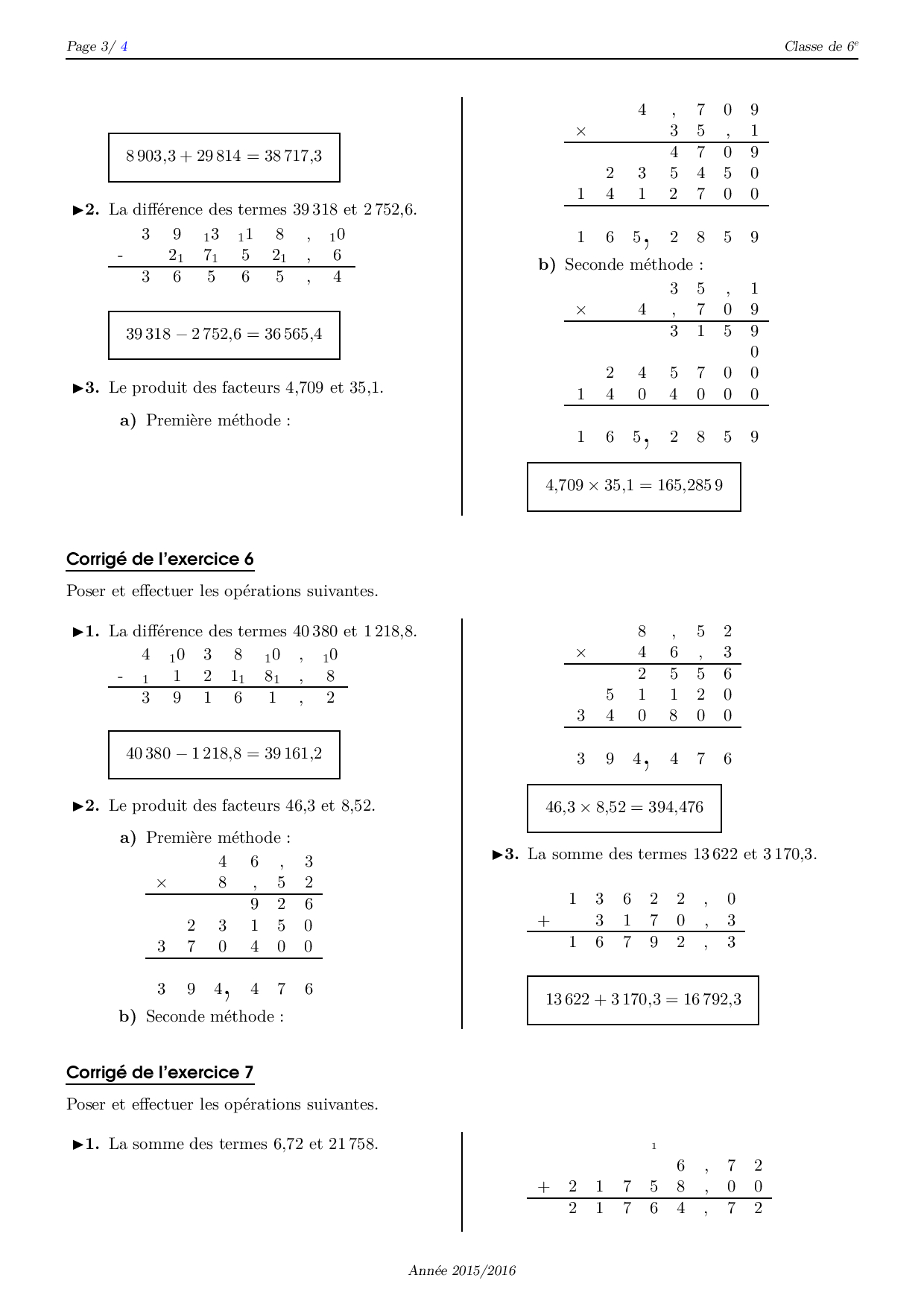Poser des opérations (sauf division) - Corrigé série d'exercices 3