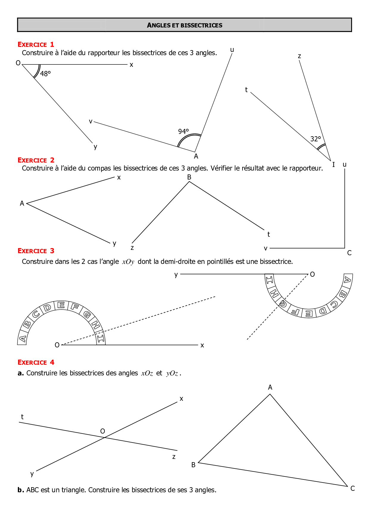 Construire la bissectrice d'un angle - Exercices