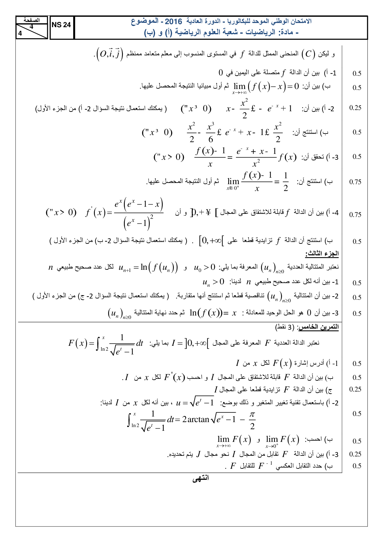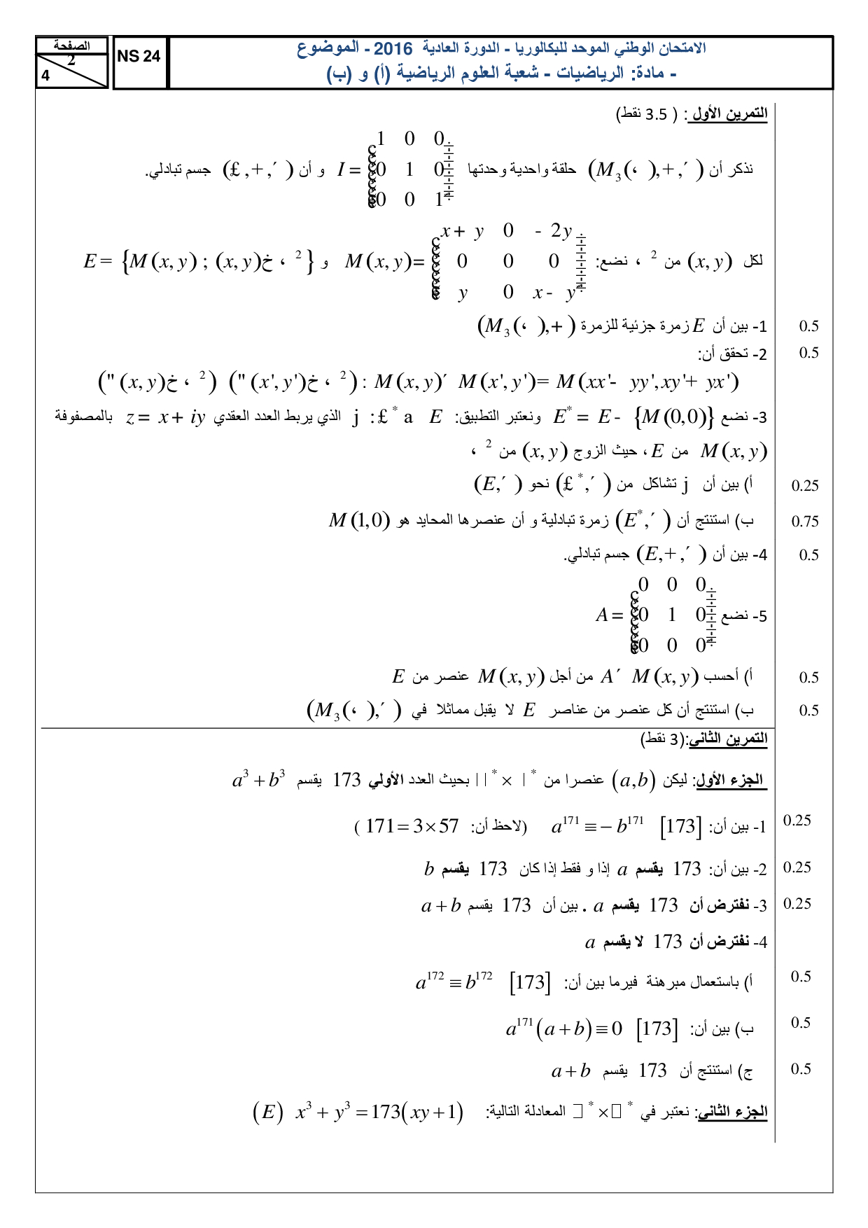 الرياضيات علوم رياضية 2016 الدورة العادية - الموضوع