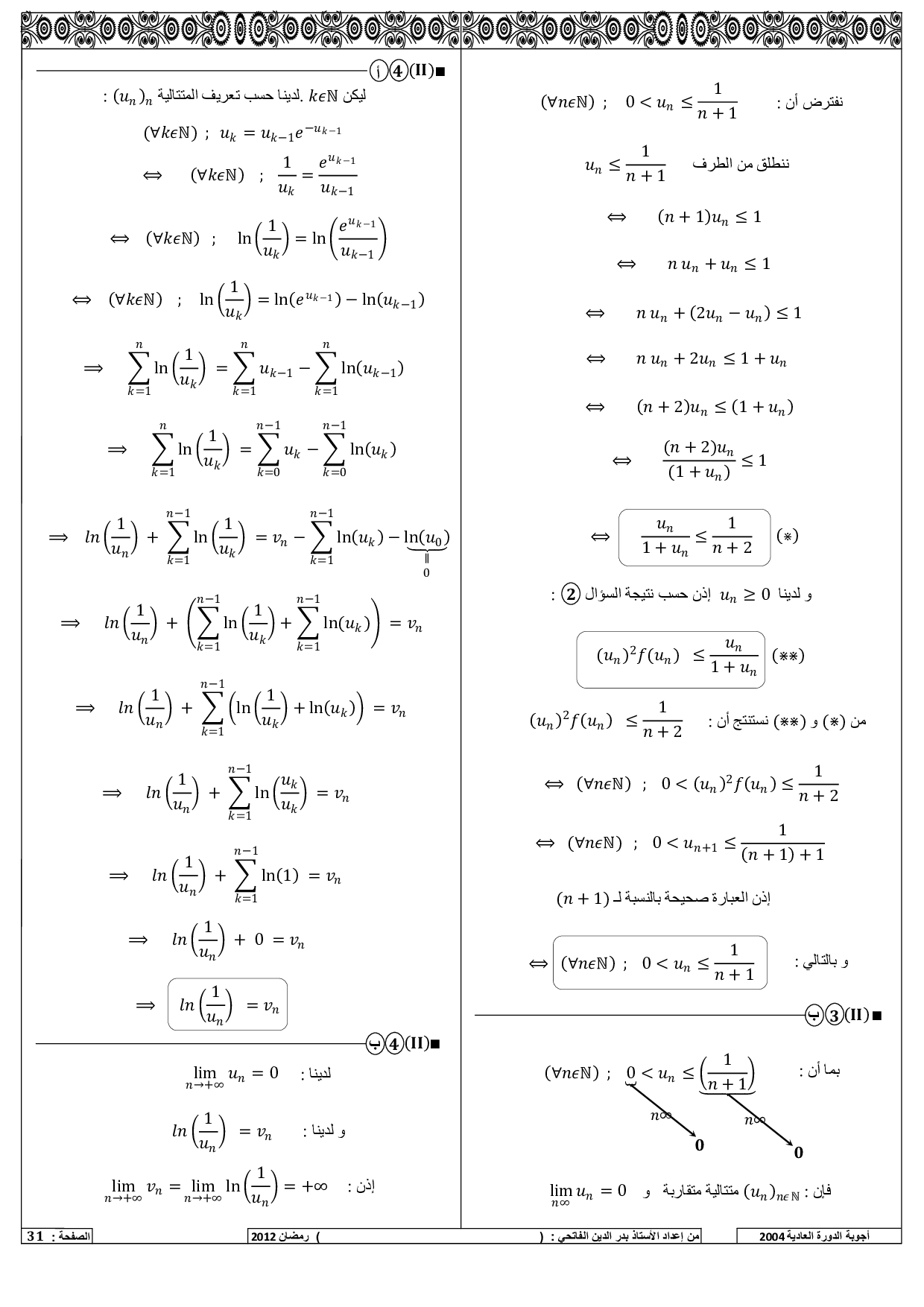 الرياضيات علوم رياضية 2004 الدورة العادية - التصحيح