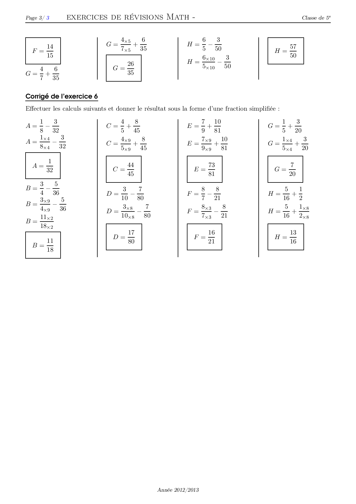 Somme de fractions - Corrigé série d'exercices 1