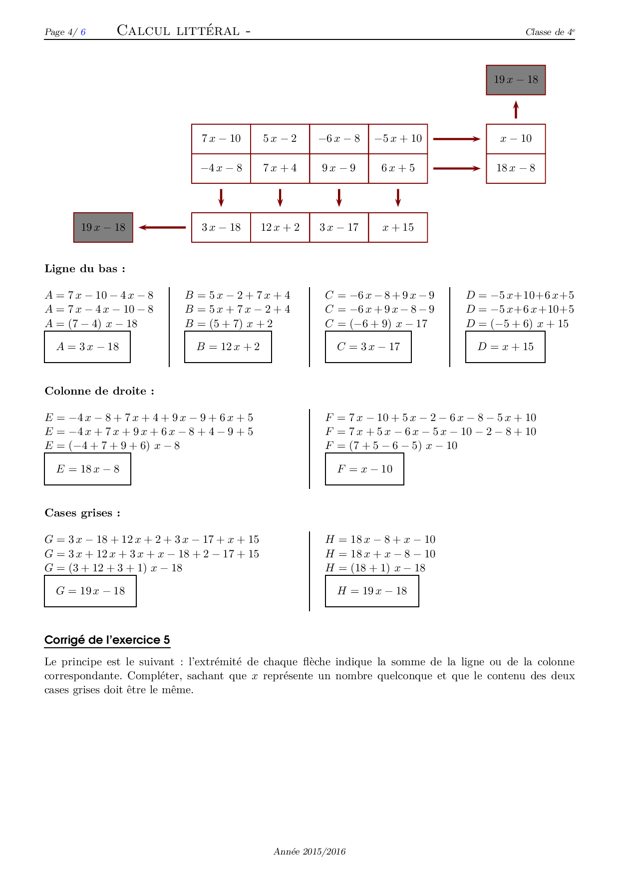 Réduire les expressions littérales - Corrigé série d'exercices 4