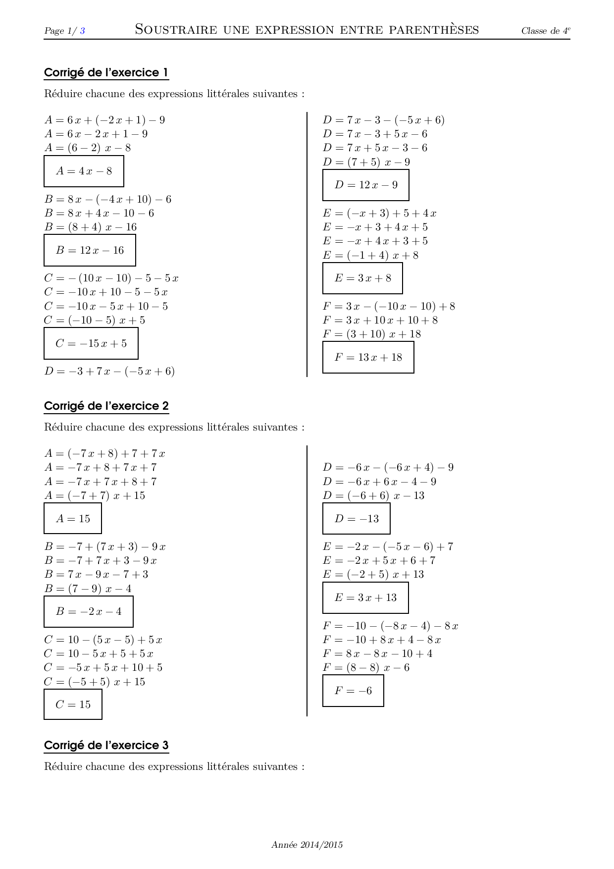 Soustraire une expression entre parenthèses - Corrigé série d'exercices 3
