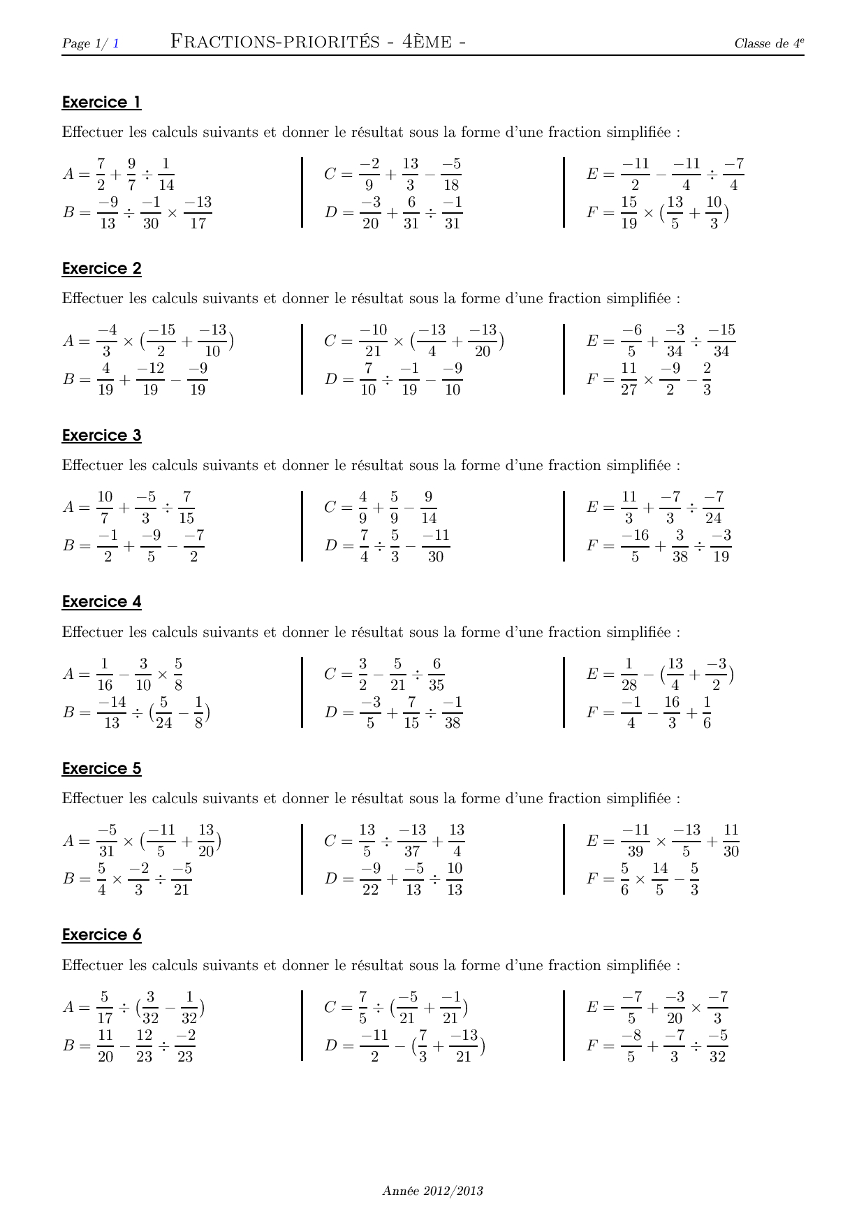 Fractions et priorités - Série d'exercices 1
