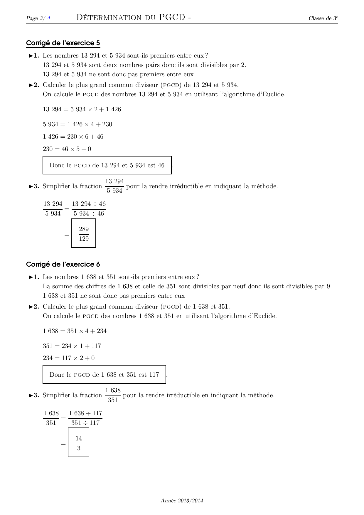 PGCD (Plus Grand Commun Diviseur) - Corrigé série d'exercices 1