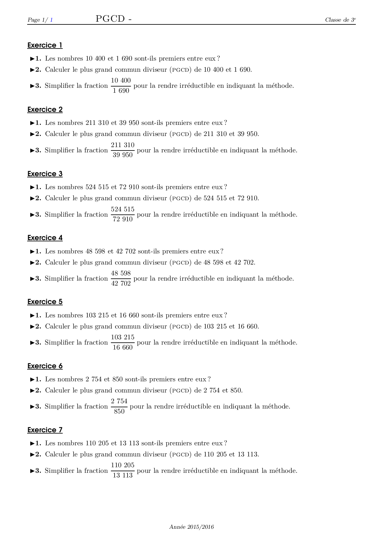 PGCD (Plus Grand Commun Diviseur) - Série d'exercices 3