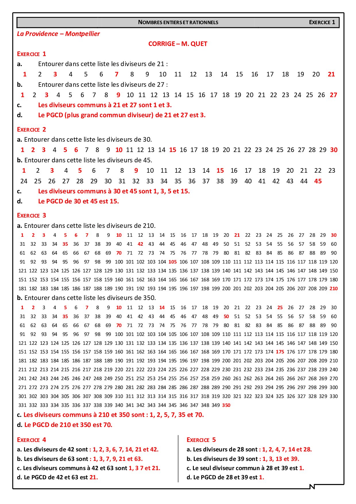 Diviseurs d'un nombre entier - Corrigés d'exercices