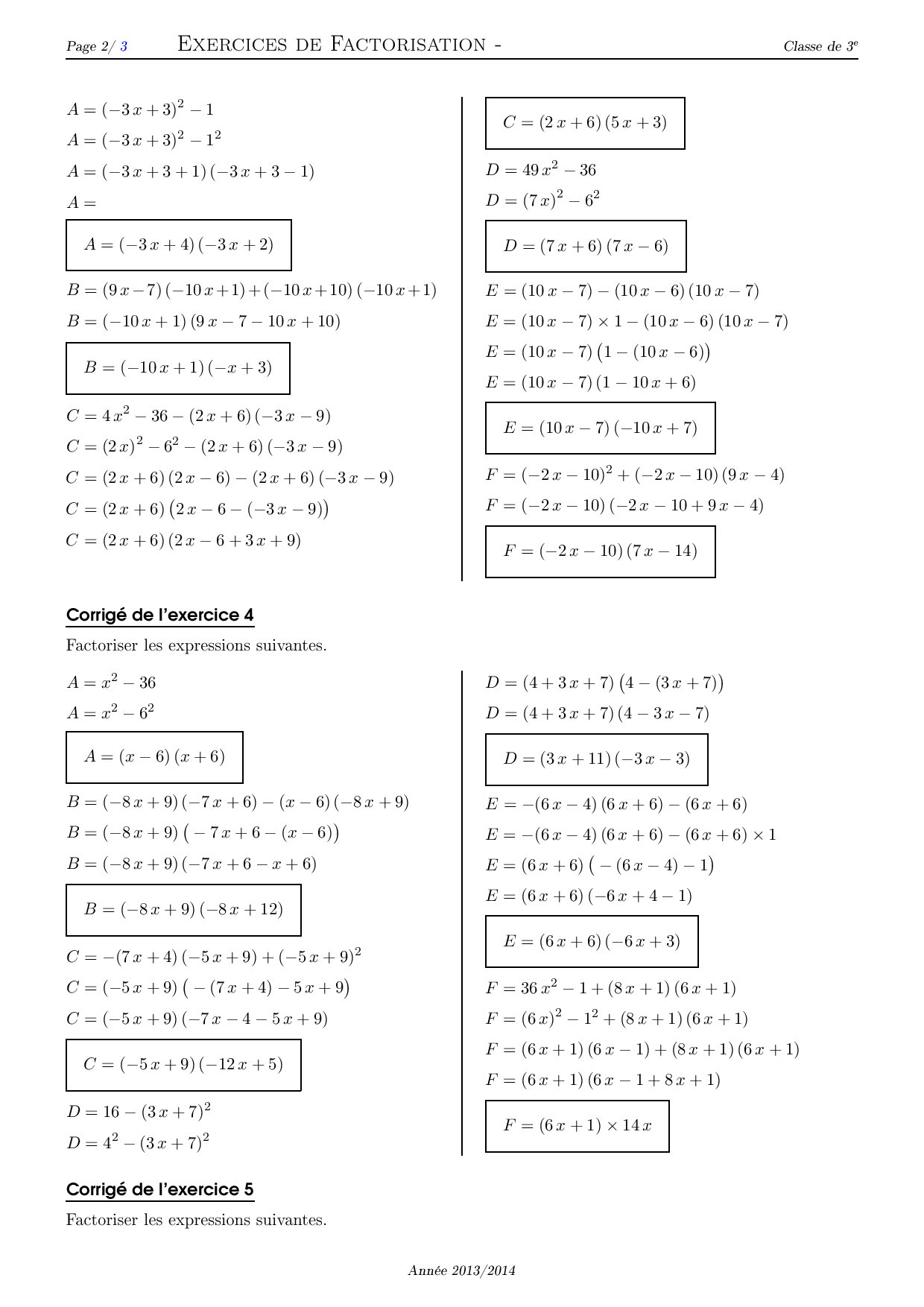Factorisation - Corrigé série d'exercices 1