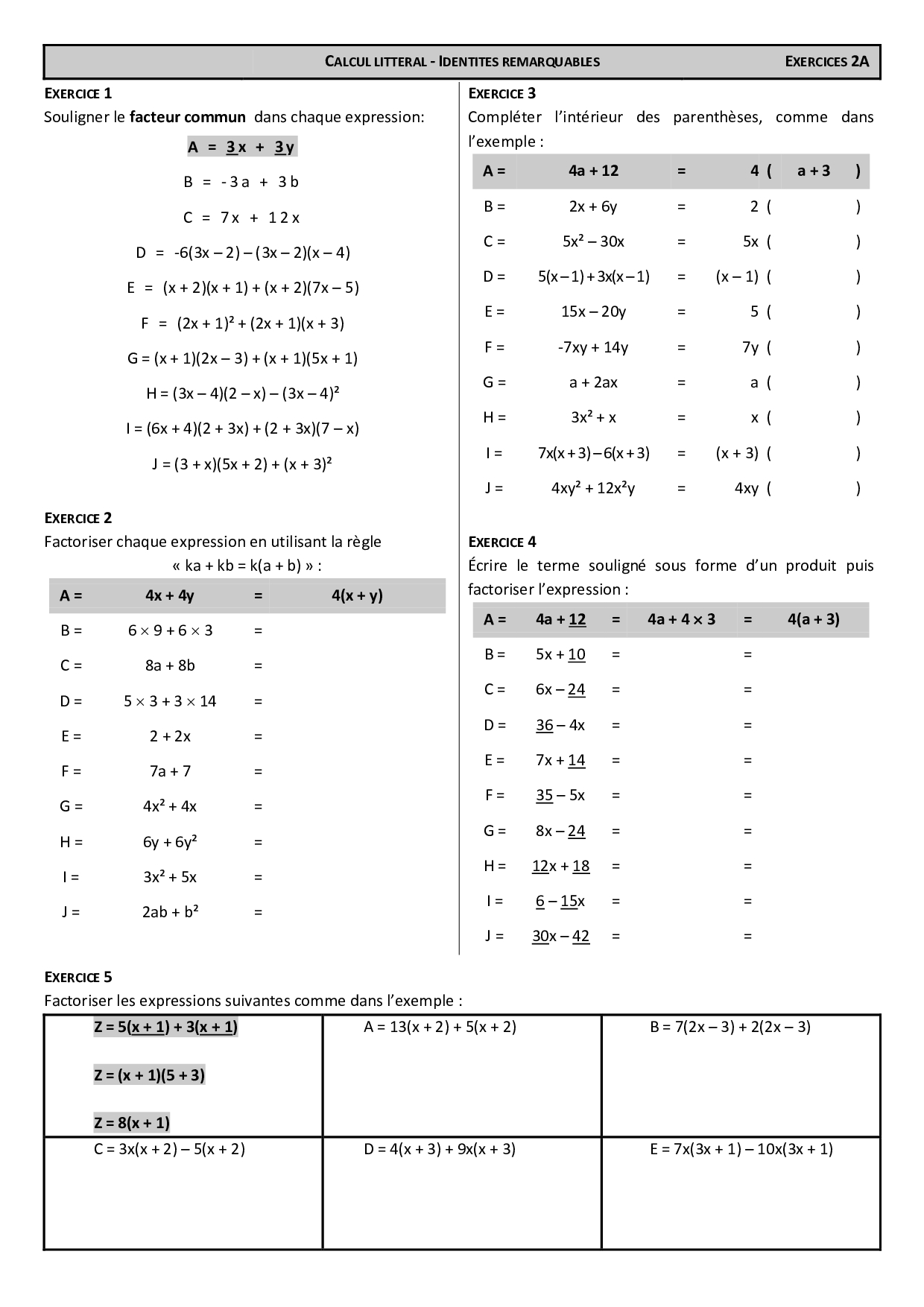 Factorisation (Facteur commun) - Exercices 1