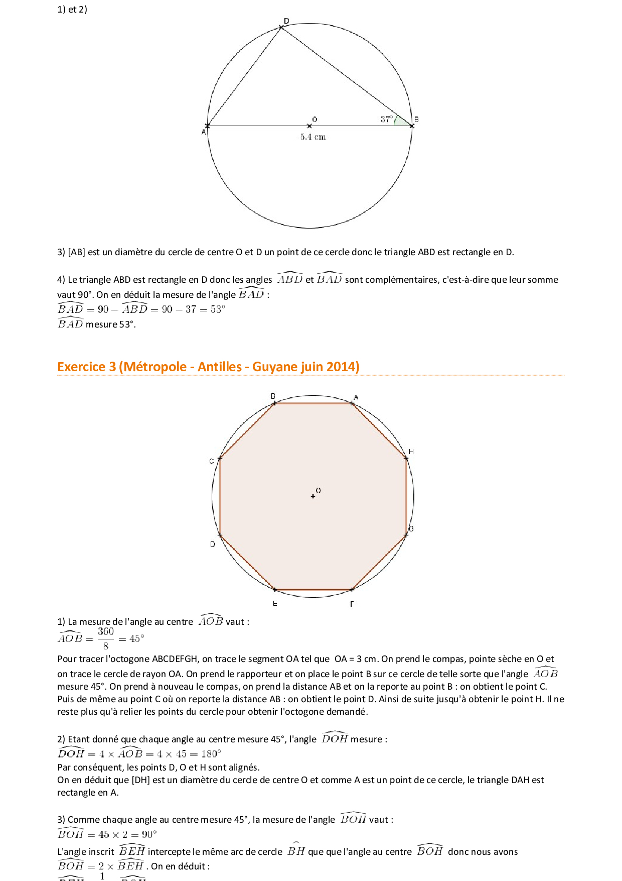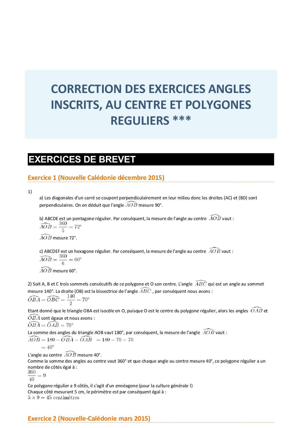 Angles inscrits - Angles au centre - Polygones réguliers - Corrigé d'exercices de brevet