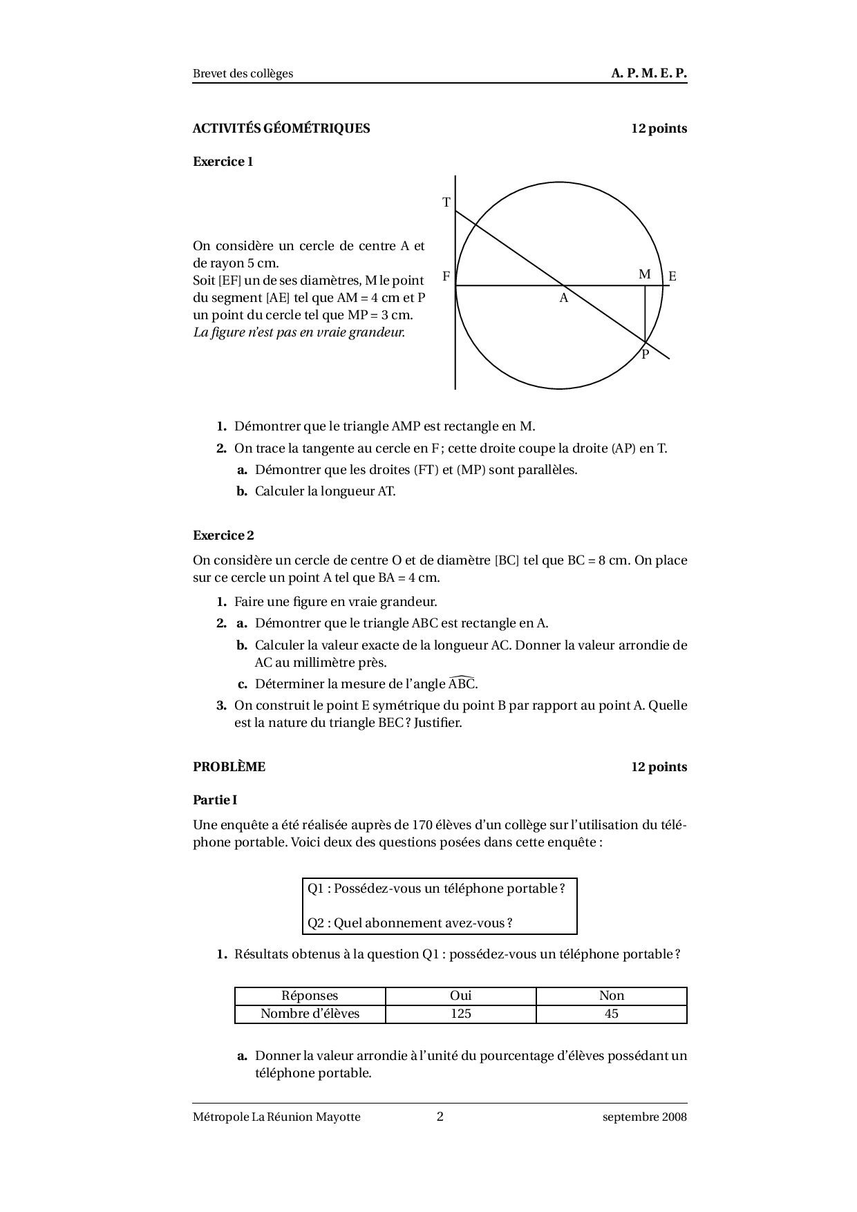Brevet Maths Métropole La Réunion septembre 2008 - Sujet