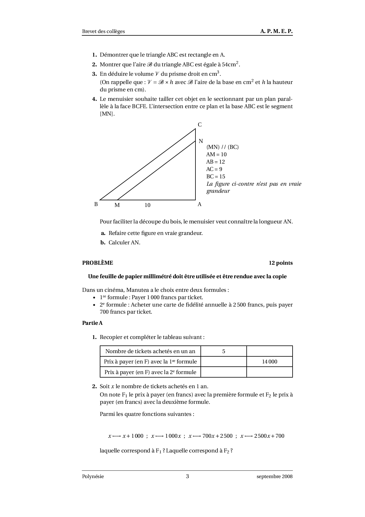 Brevet Maths Polynésie septembre 2008 - Sujet