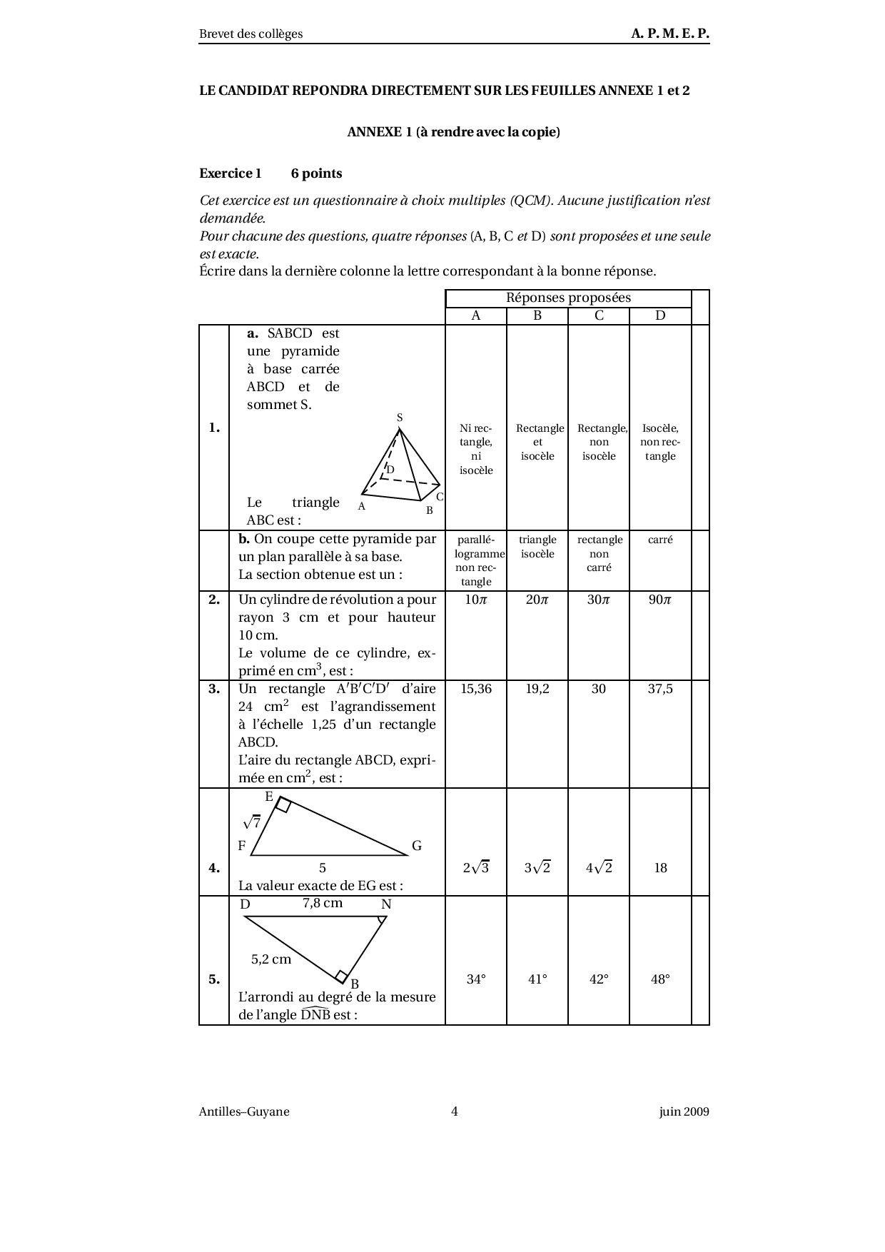 Brevet Maths Antilles-Guyane juin 2009 - Sujet