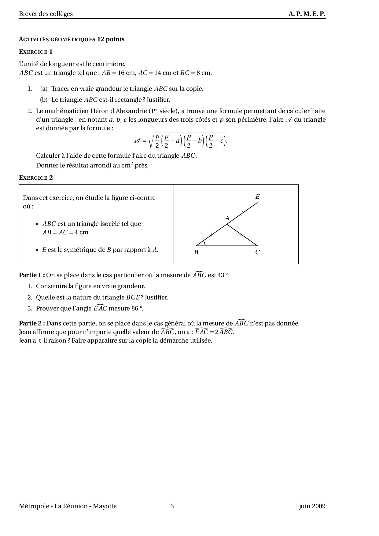 Brevet Maths Métropole La Réunion Mayotte juin 2009 - Sujet