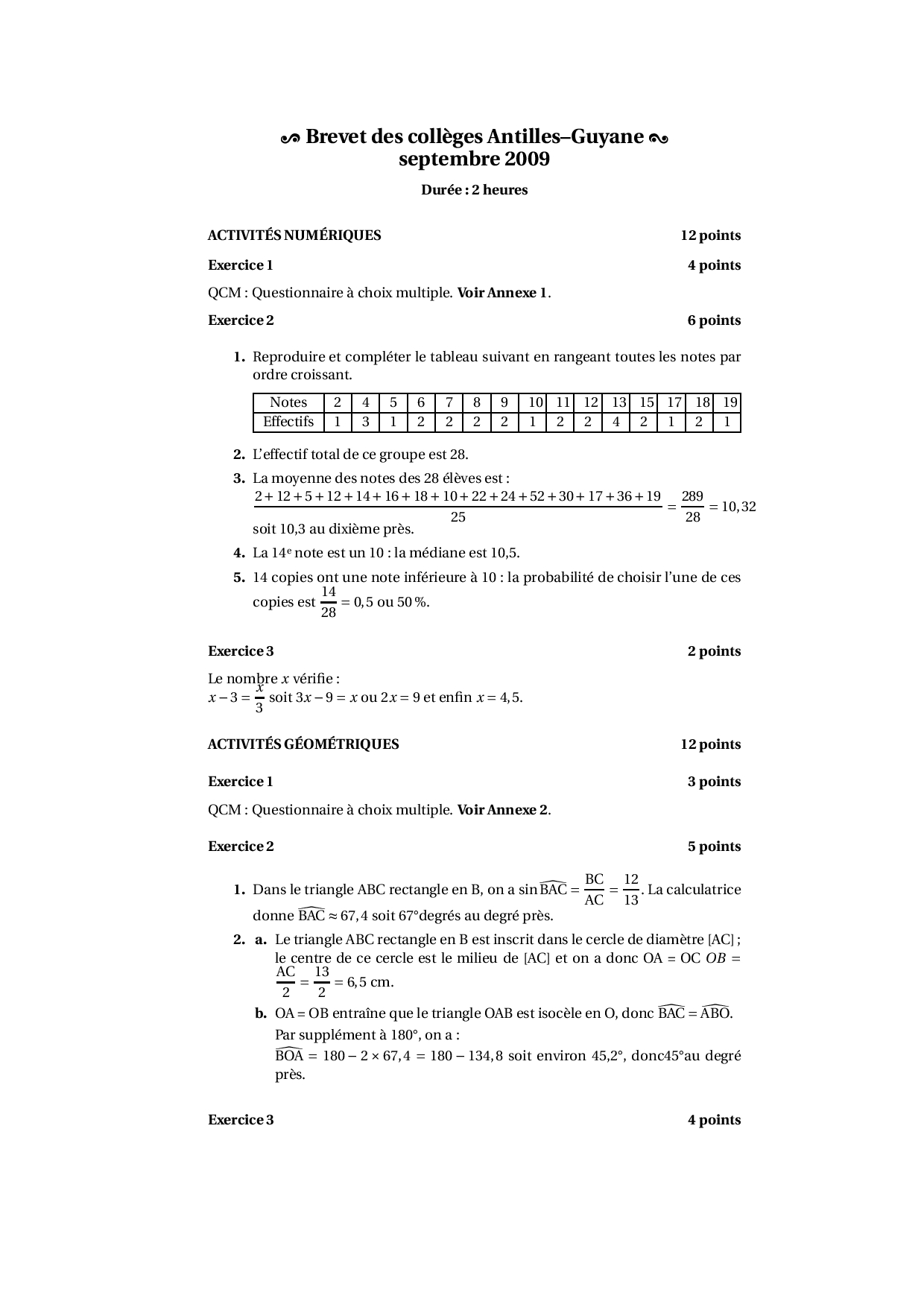 Brevet Maths Antilles-Guyane septembre 2009 - Corrigé