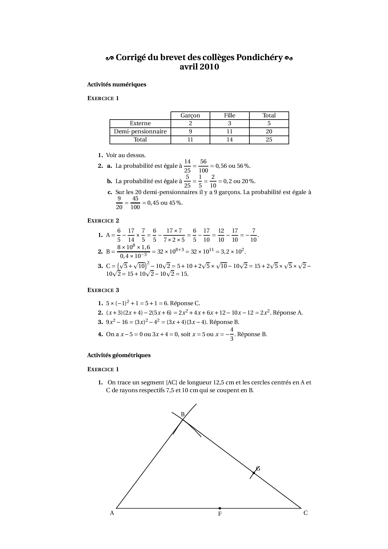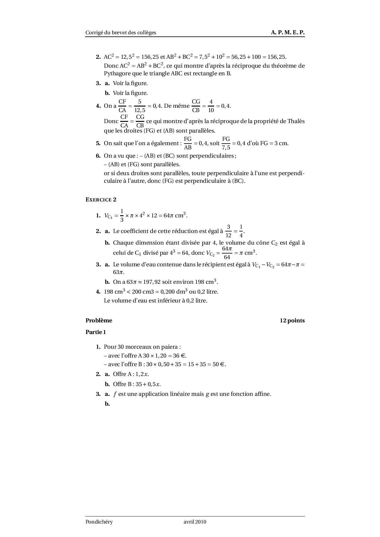 Brevet Maths Pondichéry avril 2010 - Corrigé