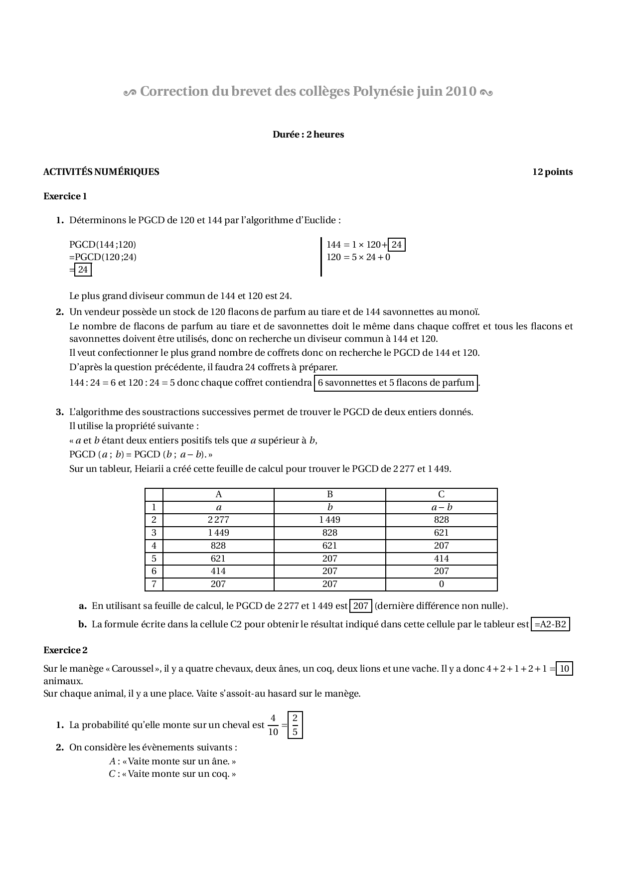 Brevet Maths Polynésie juin 2010 - Corrigé