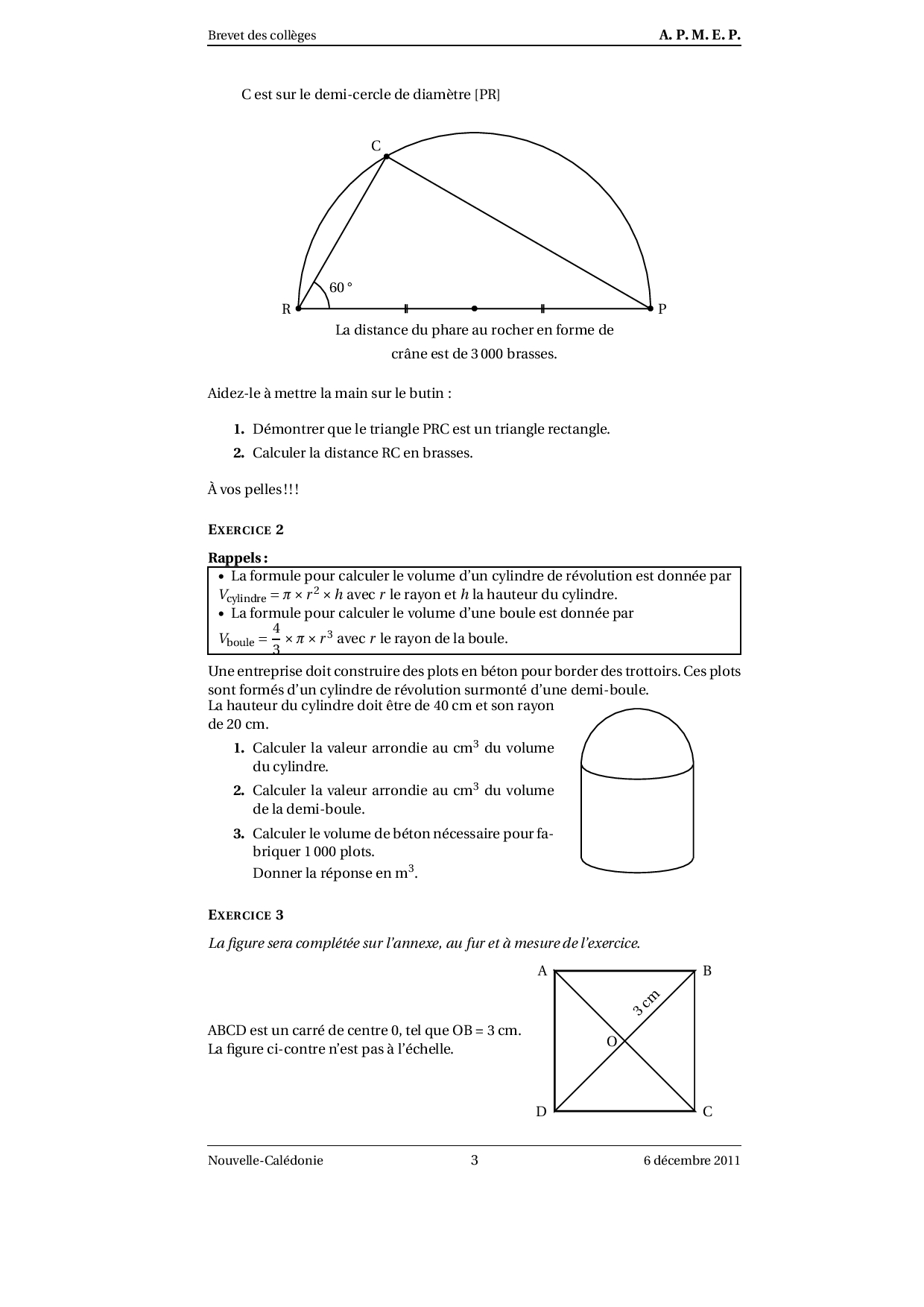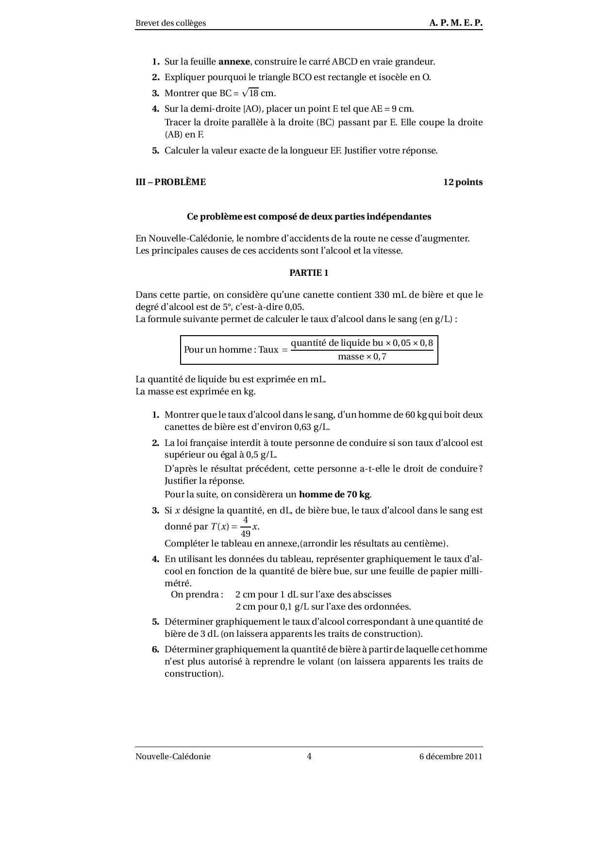 Brevet Maths Nouvelle-Calédonie décembre 2011 - Sujet