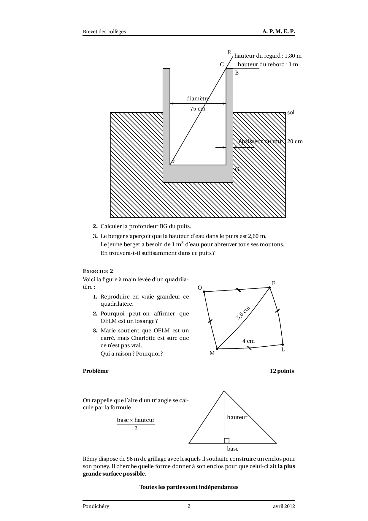 Brevet Maths Pondichéry avril 2012 - Sujet