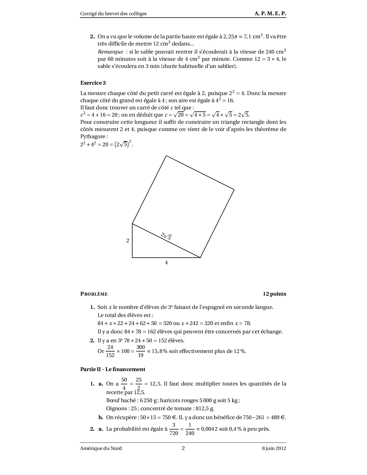 Brevet Maths Amérique du Nord juin 2012 - Corrigé