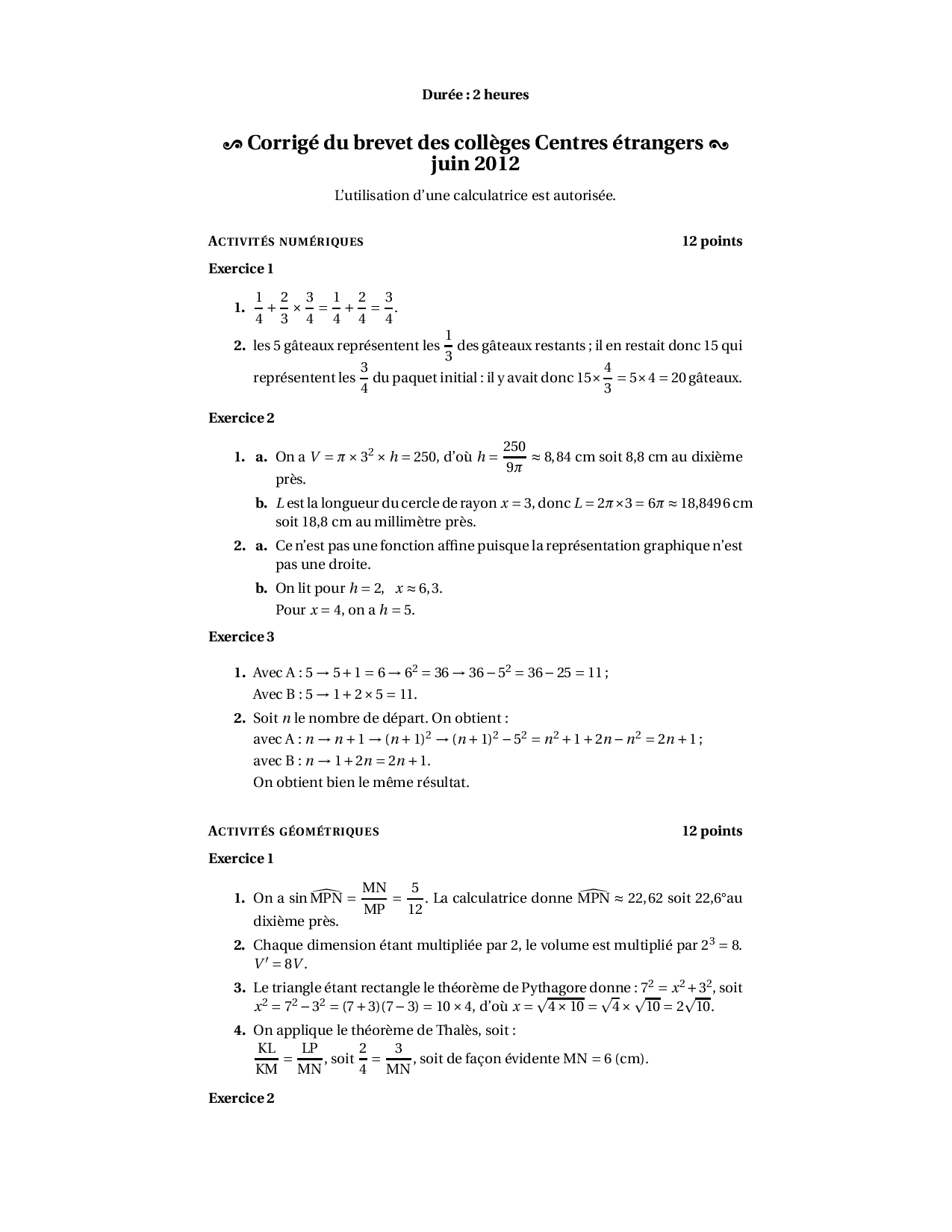 Brevet Maths Centres étrangers juin 2012 - Corrigé