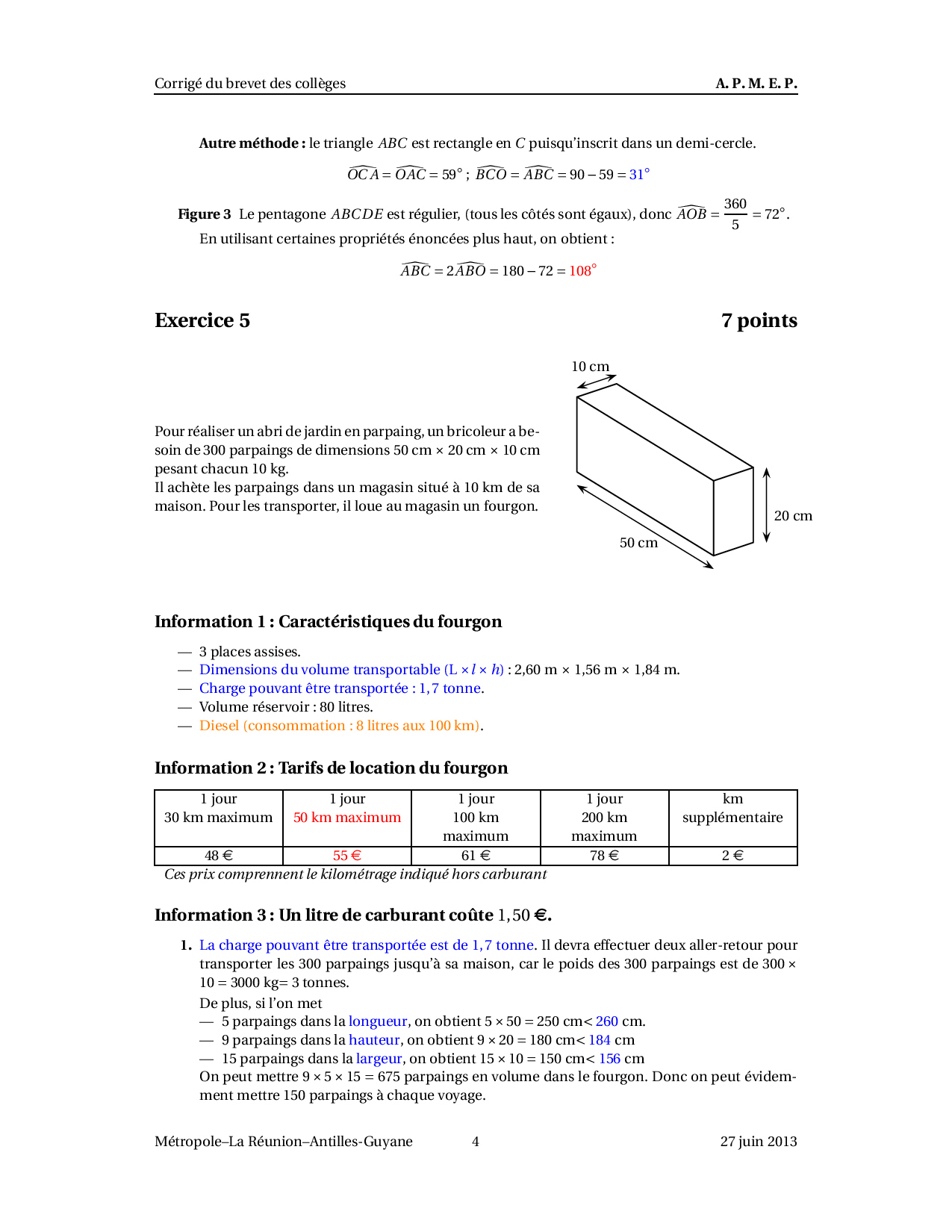 Brevet Maths Métropole Antilles-Guyane La Réunion juin 2013 - Corrigé