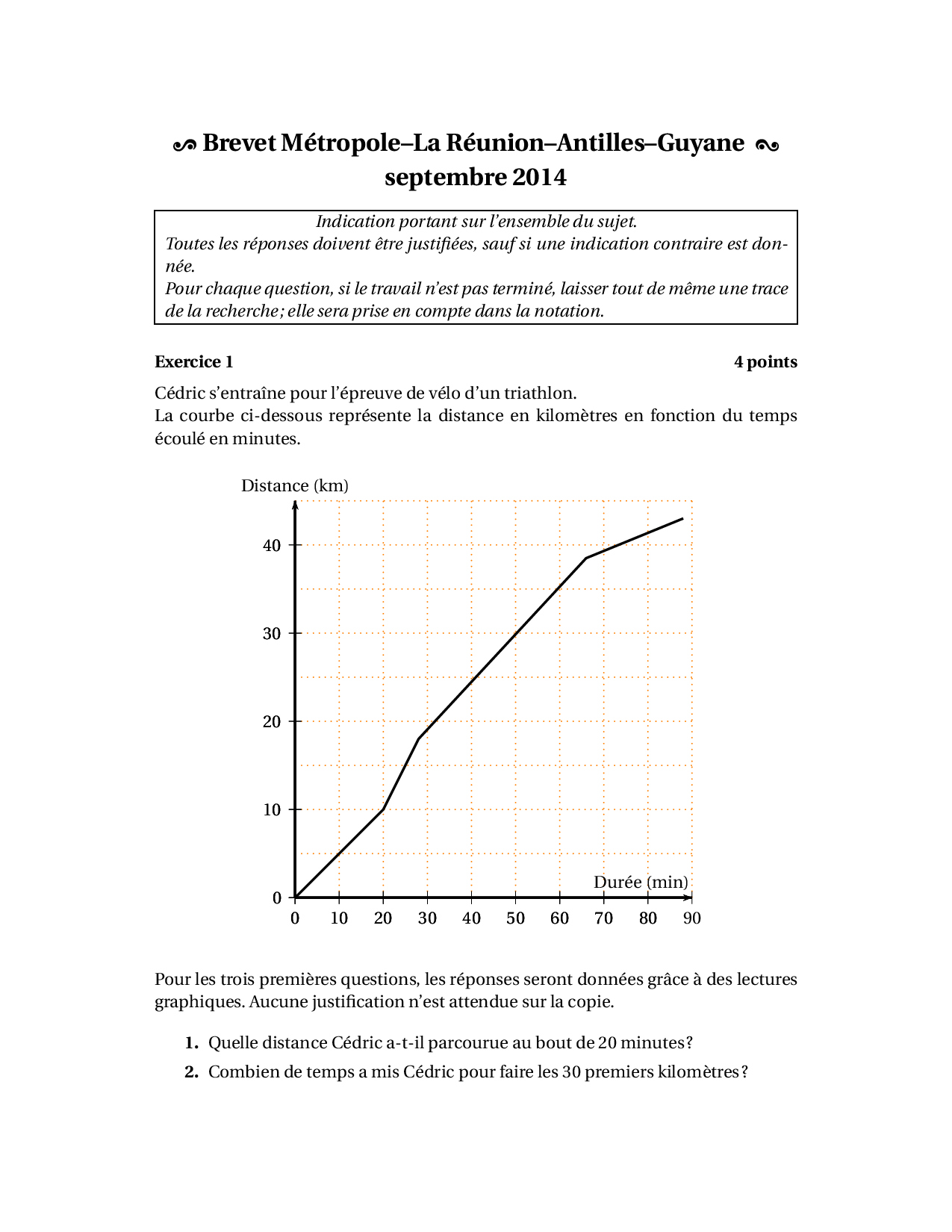 Brevet Maths Métropole Antilles Guyane septembre 2014 - Sujet