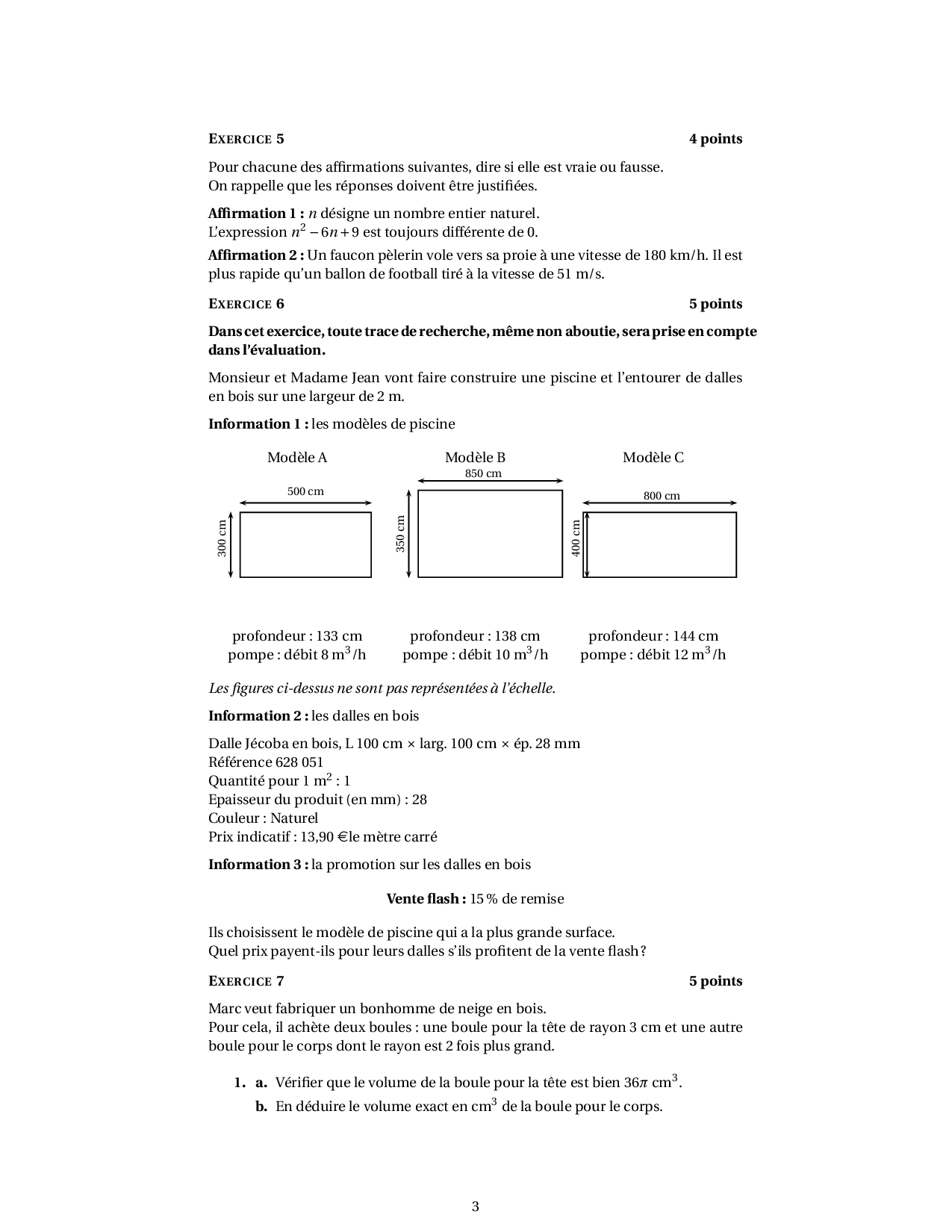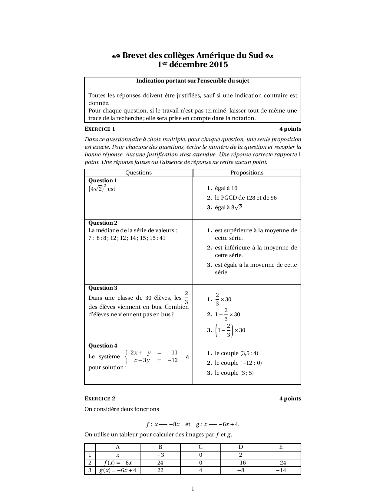 Brevet Maths Amérique du Sud décembre 2015 - Sujet