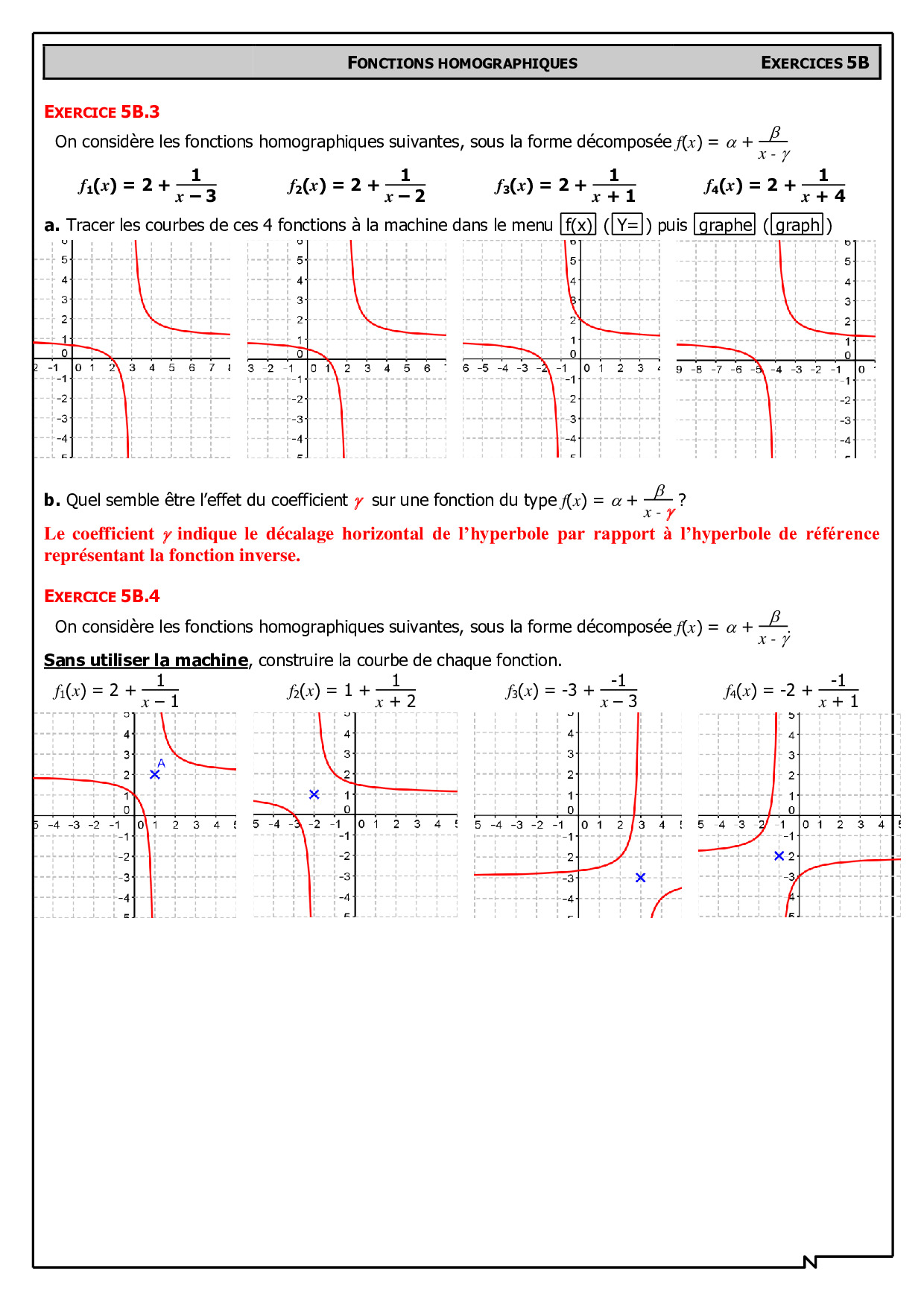 Fonctions homographiques - Utilisation de la machine pour conjecturer - Corrigés d'exercices
