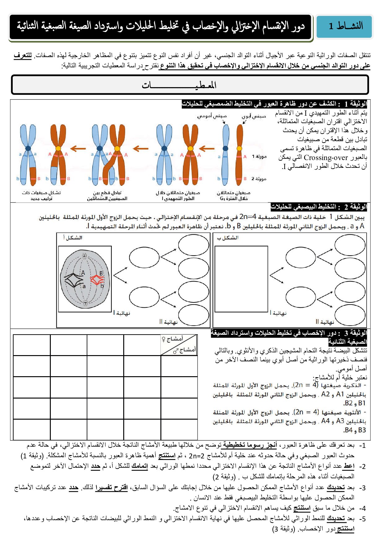 دور الإنقسام الإختزالي والإخصاب في تخليط الحليلات واسترداد الصيغة الصبغية الثنائية - أنشطة