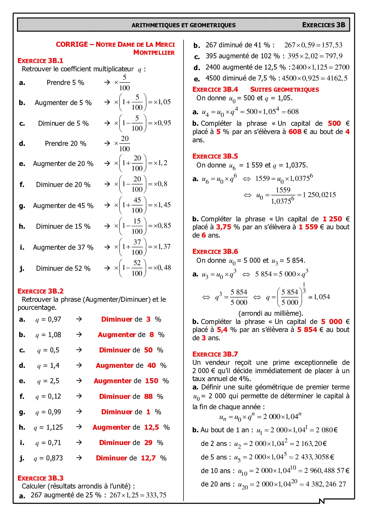 Pourcentages et suites - Corrigés d'exercices