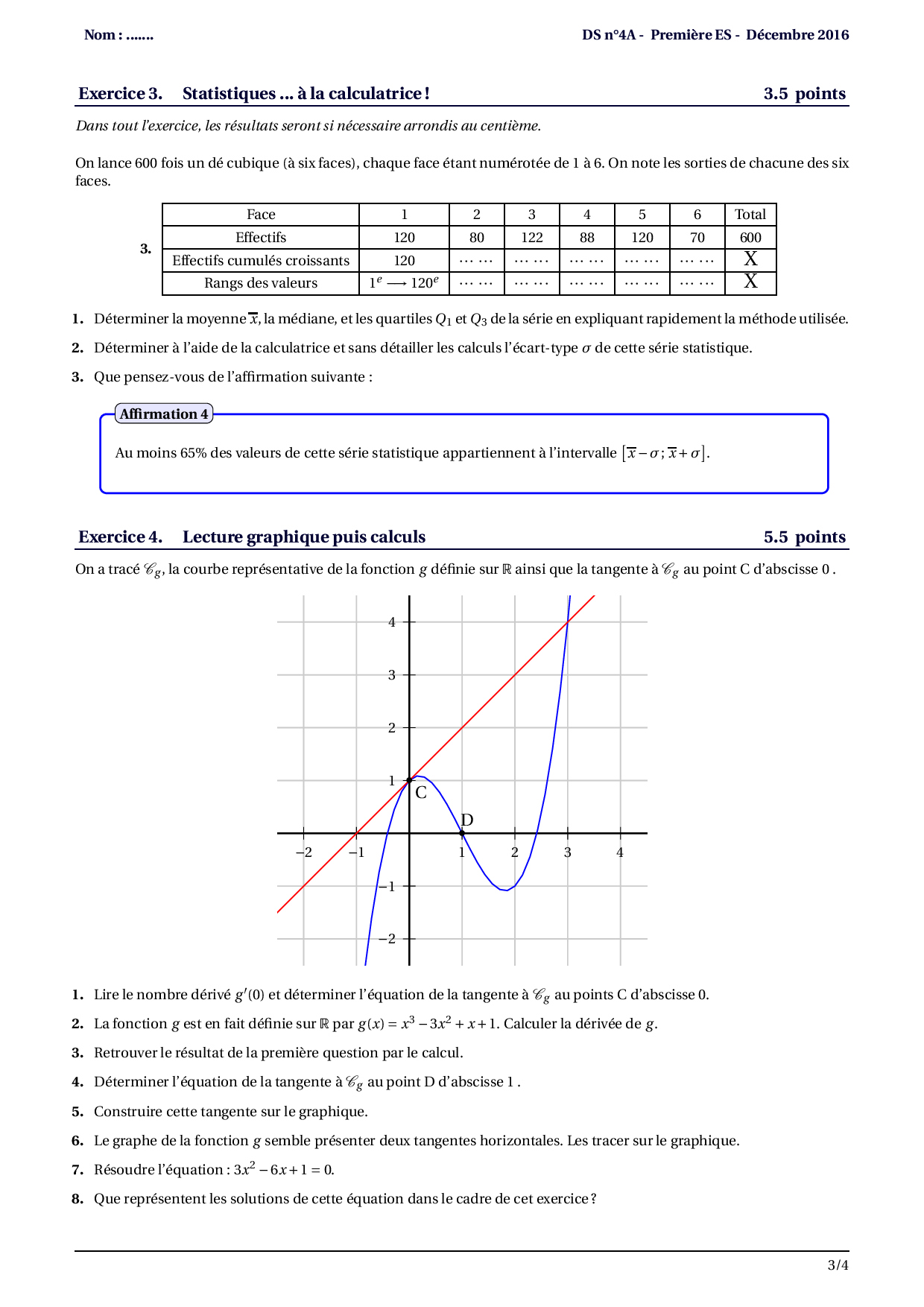 Devoir 3 (Second degré, statistiques, dérivation, pourcentages)