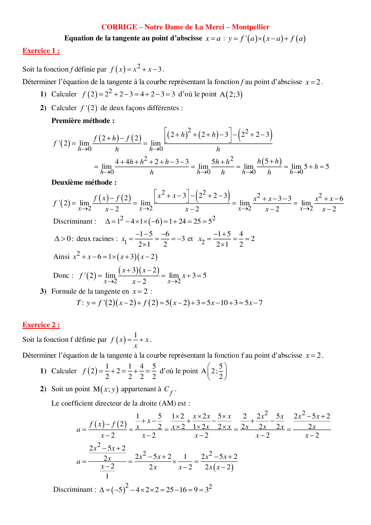 Equations de tangentes - Corrigés d'exercices 2